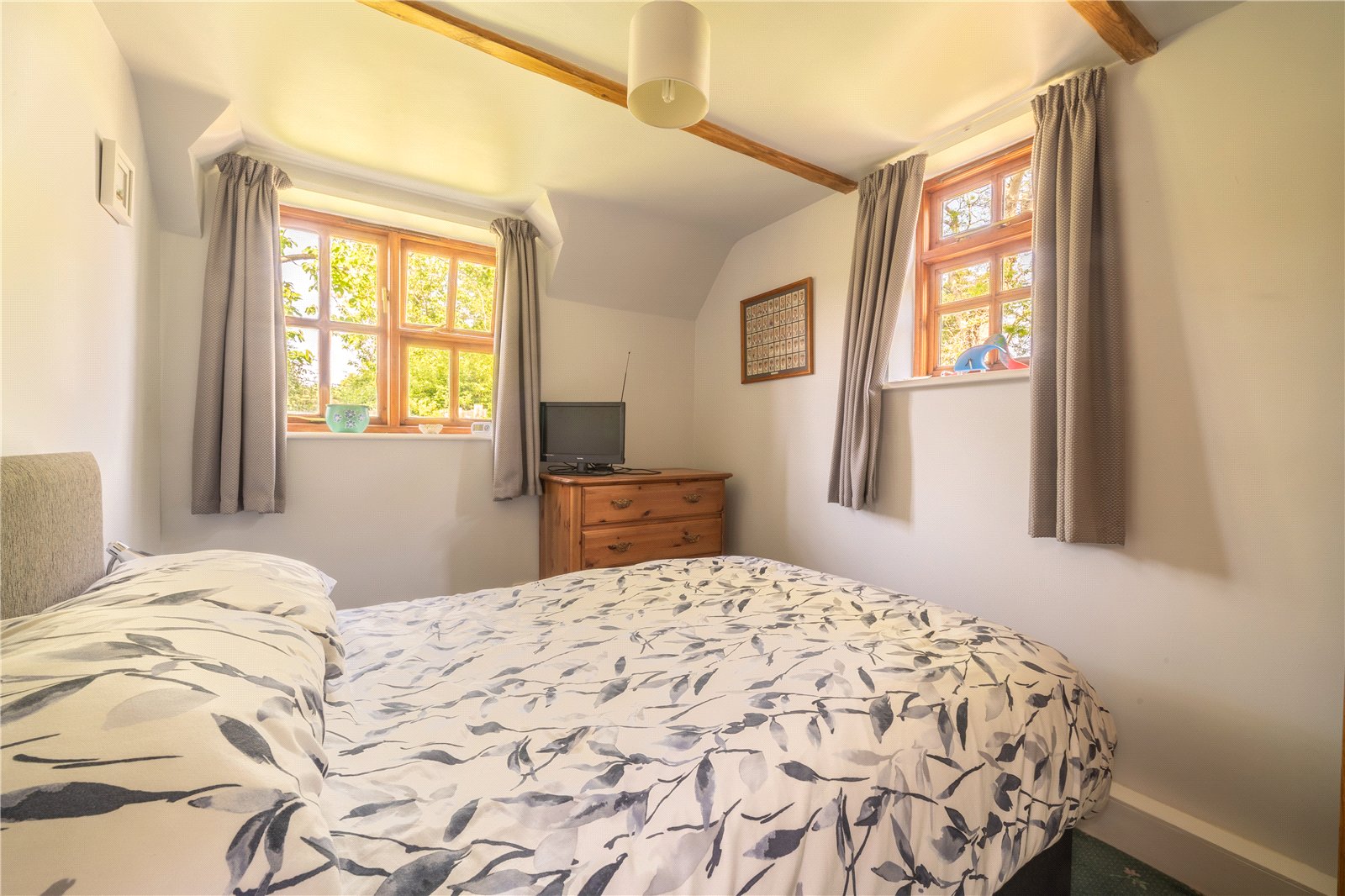 BEDROOM ONE: A double-sized room and double aspect room with radiator, beamed ceiling, and some beams to the walls, cottage-style windows with aspect to gardens and views over farmland.