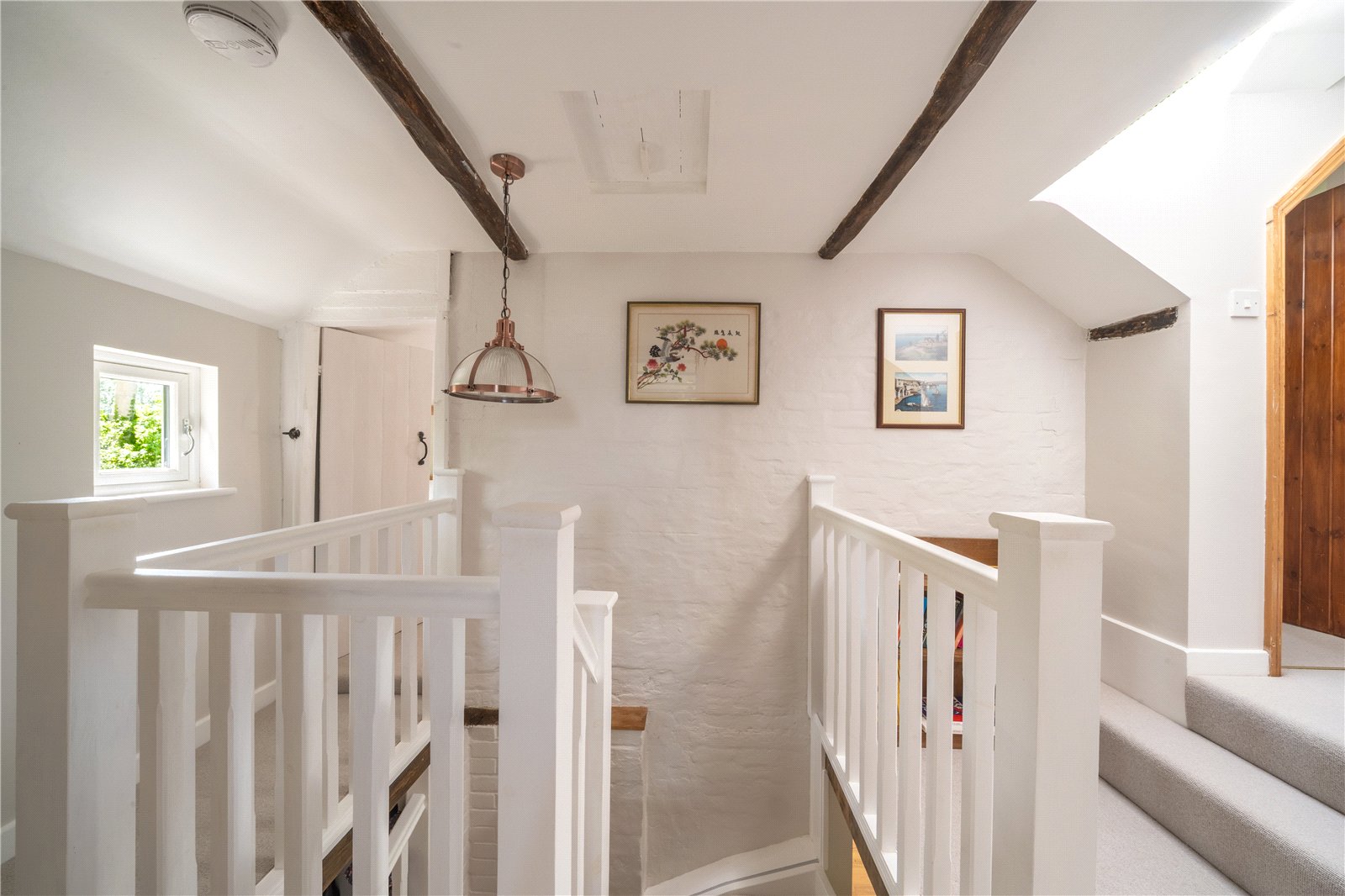 FIRST FLOOR LANDING WITH GALLERIED AREAS: Comprising of exposed beams to ceiling and walls, further skylight double glazed window, doors leading off to bedrooms 1,2,3 and 4, as well as the family bathroom/shower room.