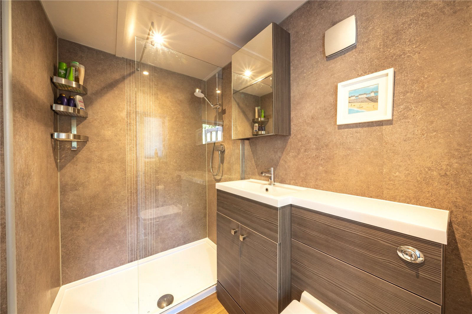 CLOAKROOM / SHOWER ROOM: Comprising of a WC, a fitted wash basin with chrome mixer tap and vanity cupboards under, radiator/towel rail, large walk-in shower with chrome shower control system, down lighting.