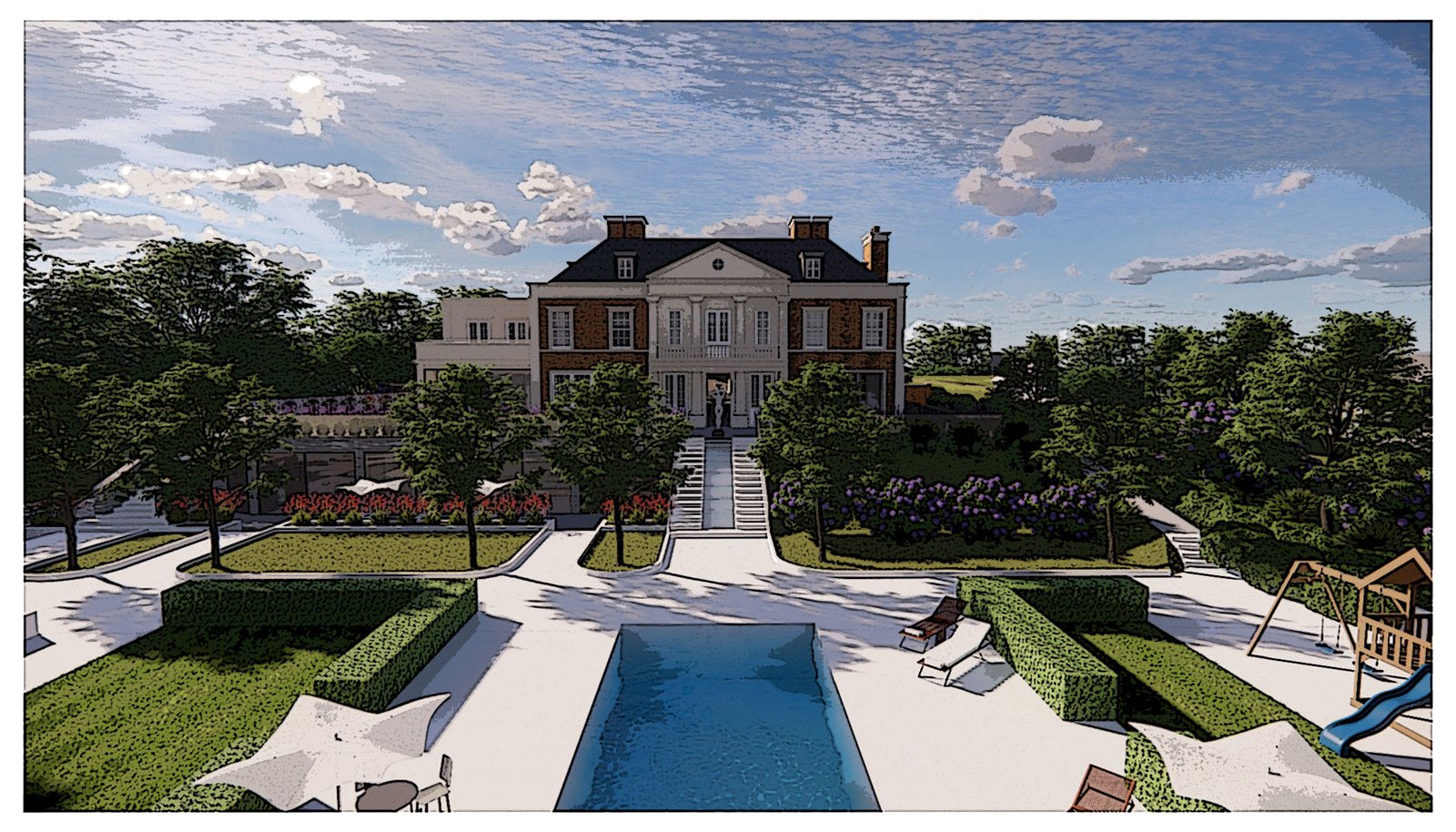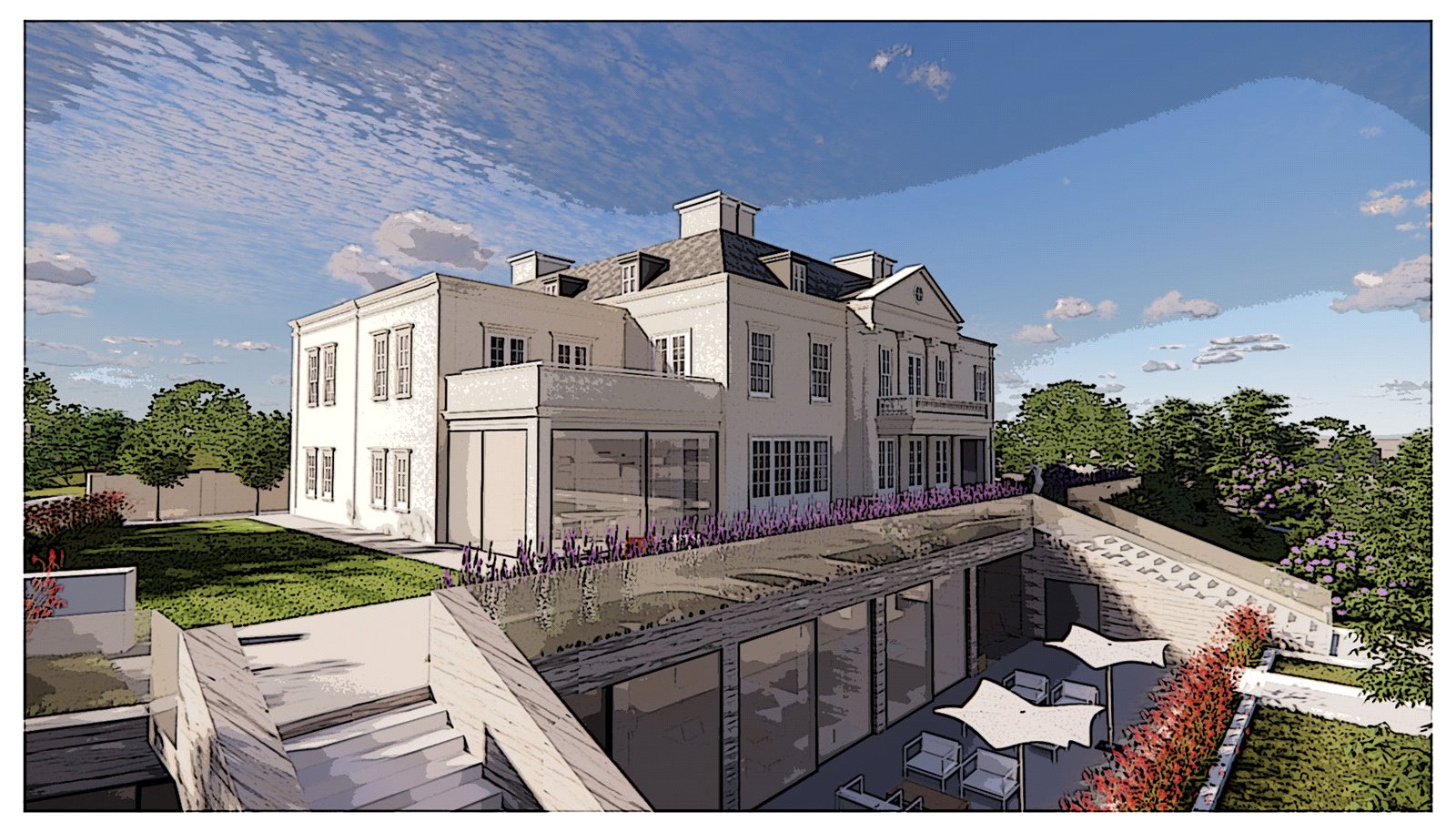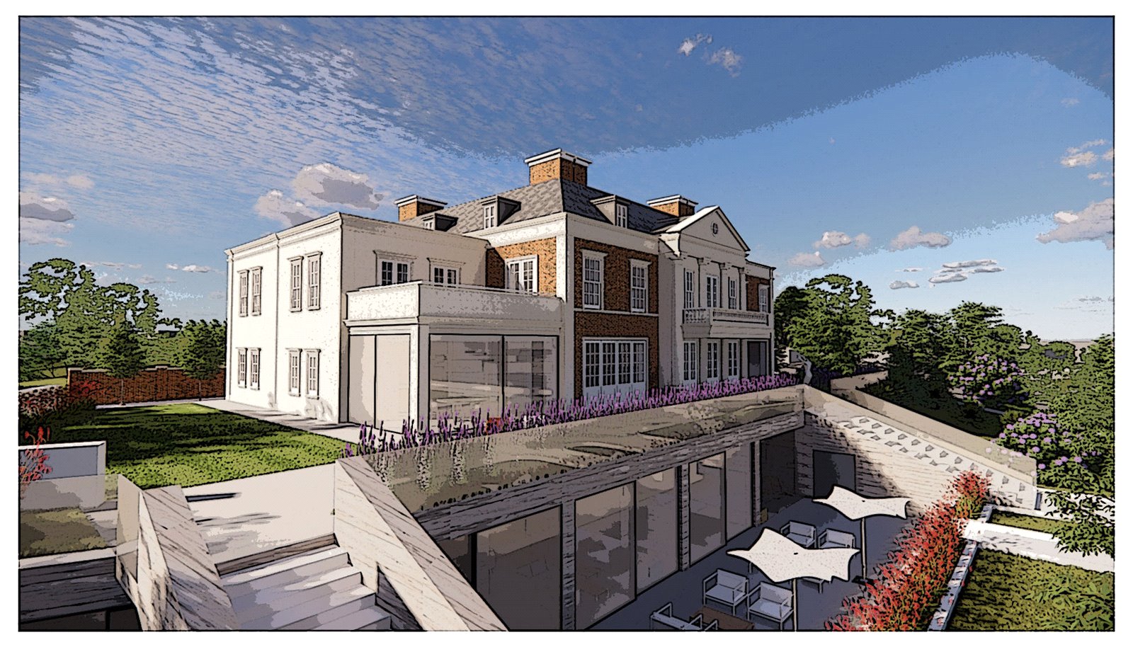 The rear gardens are probably to be the most stunning design of this bespoke neo-Georgian country house plot. These are to be comprised of neo classical terraces and paved paths with water features and even a further outdoor pool if require.