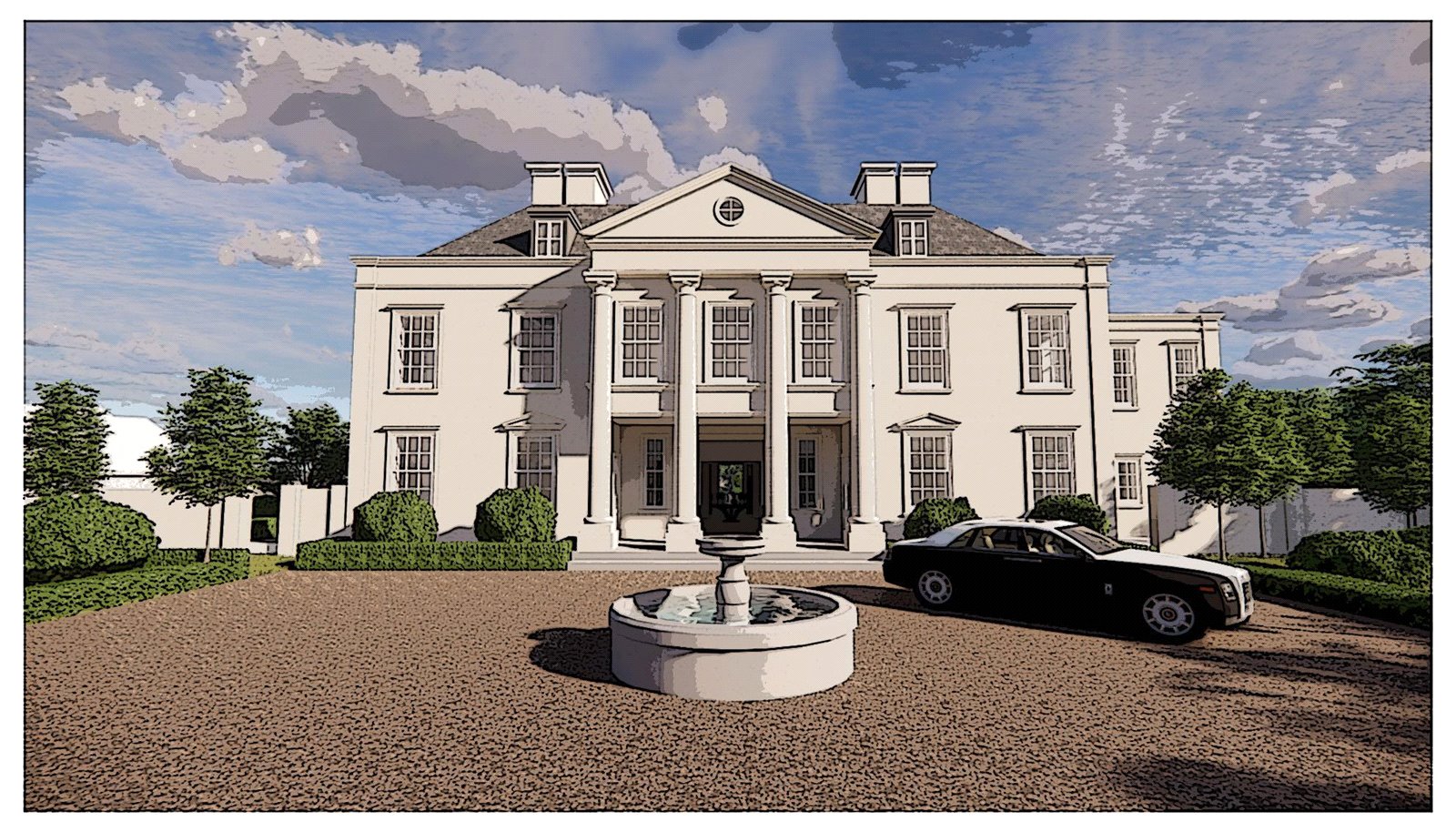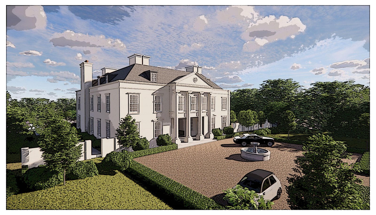 • Planning permission for probably the finest bespoke luxury building plot with the most fabulous permission granted for an extremely unique and incredibly substantial and imposing neo classical Georgian styled mansion of circa 19,000 square feet