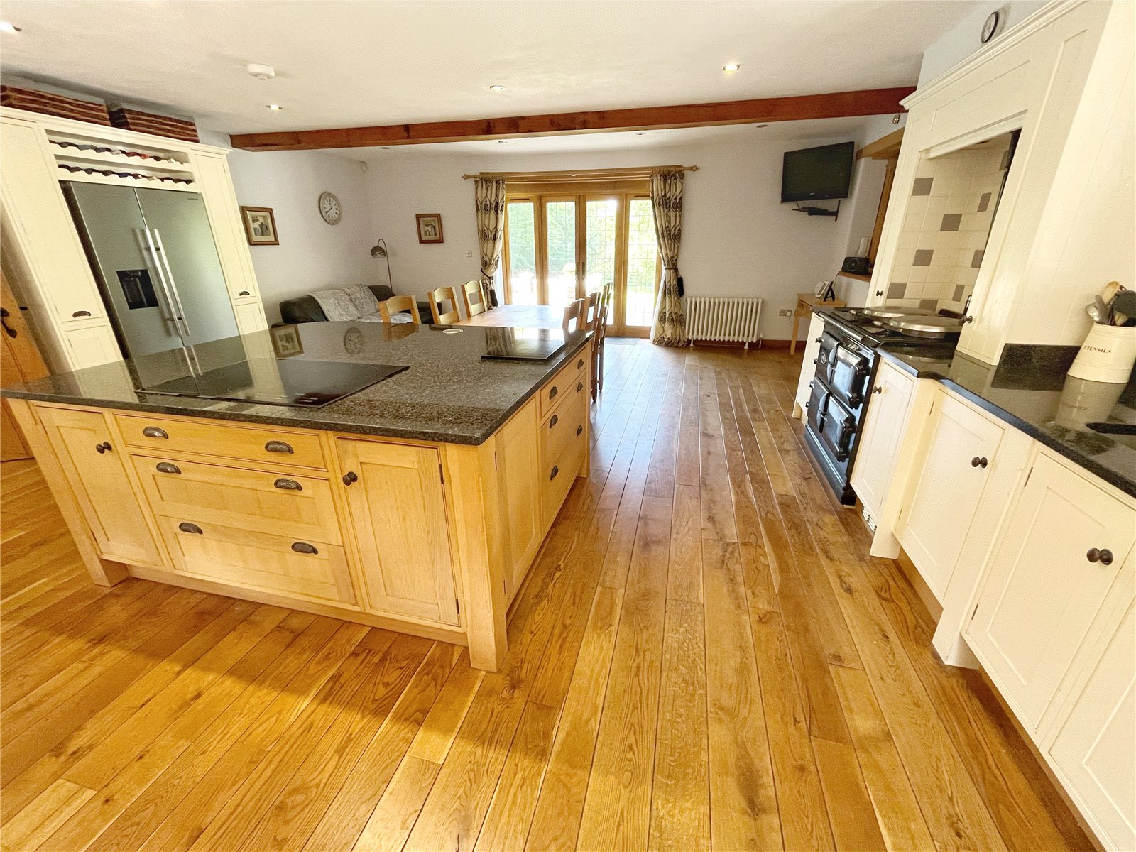 LUXURIOUS & SPACIOUS KITCHEN / BREAKFAST ROOM WITH A FURTHER LOUNGE AREA: Being a triple aspect room with oak floors, downlighting beamed ceiling, radiators, feature AGA cooking range, extensive range of bespoke cupboard and base units with marble work tops, inset twin sink units and chrome mixer tap, integrated dishwasher fitted ovens, fitted microwave, space for American fridge freezer, large feature island with marble top, fitted ceramic hob, breakfast bar, preparation areas, space for large breakfast table in addition to the breakfast bar, double glazed window with aspect to the front gardens, further double glazed windows with aspect to the rear gardens and further French doors opening out onto the rear sun terrace, door to the adjoining utility room.