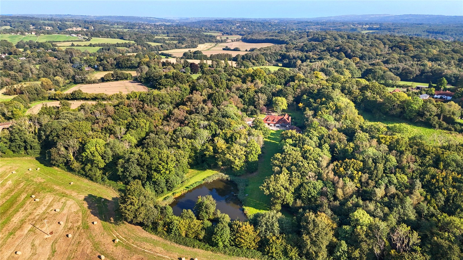 LOCATION: Situated within its own circa 8 acres (to be verified) of seclusion and backing onto open farmland and enjoying fabulous far reaching views, this unique and fine bespoke modern country residence is only a short drive away from Battle with its mainline train station for London, making this property perfect for London commuters.