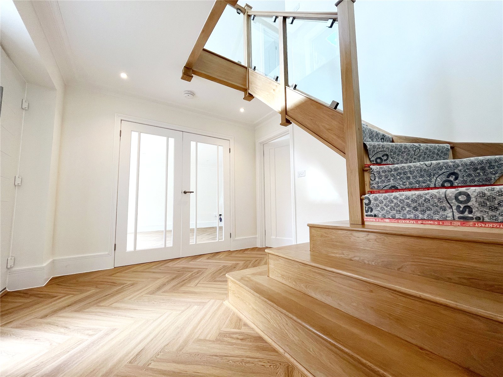 RECEPTION HALL: A generous room with an abundance of natural light and oak styled flooring with underfloor heating, feature staircase leading to the first-floor landing, double glazed window with aspect to the front landscaped garden, feature door to coats cupboards, further feature doors leading off to a double aspect lounge / games room, a large open plan sitting room, a luxury kitchen / breakfast room and open plan dining room and a downstairs cloakroom.