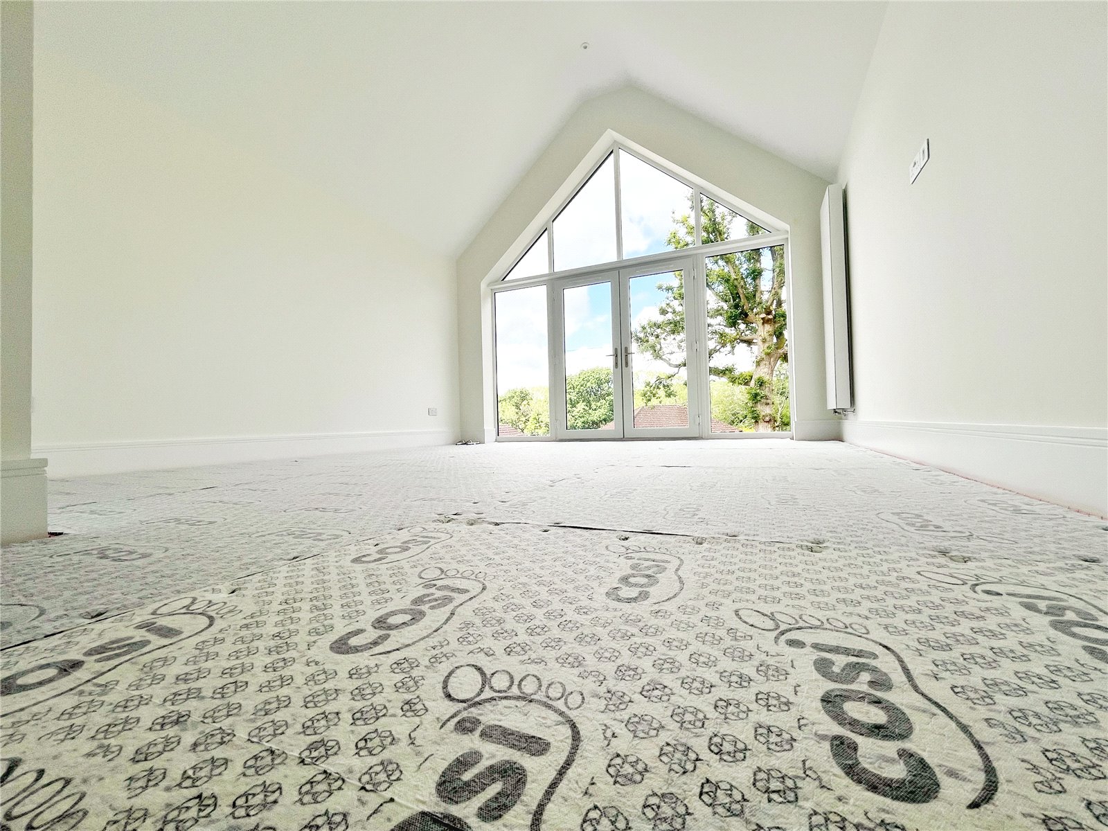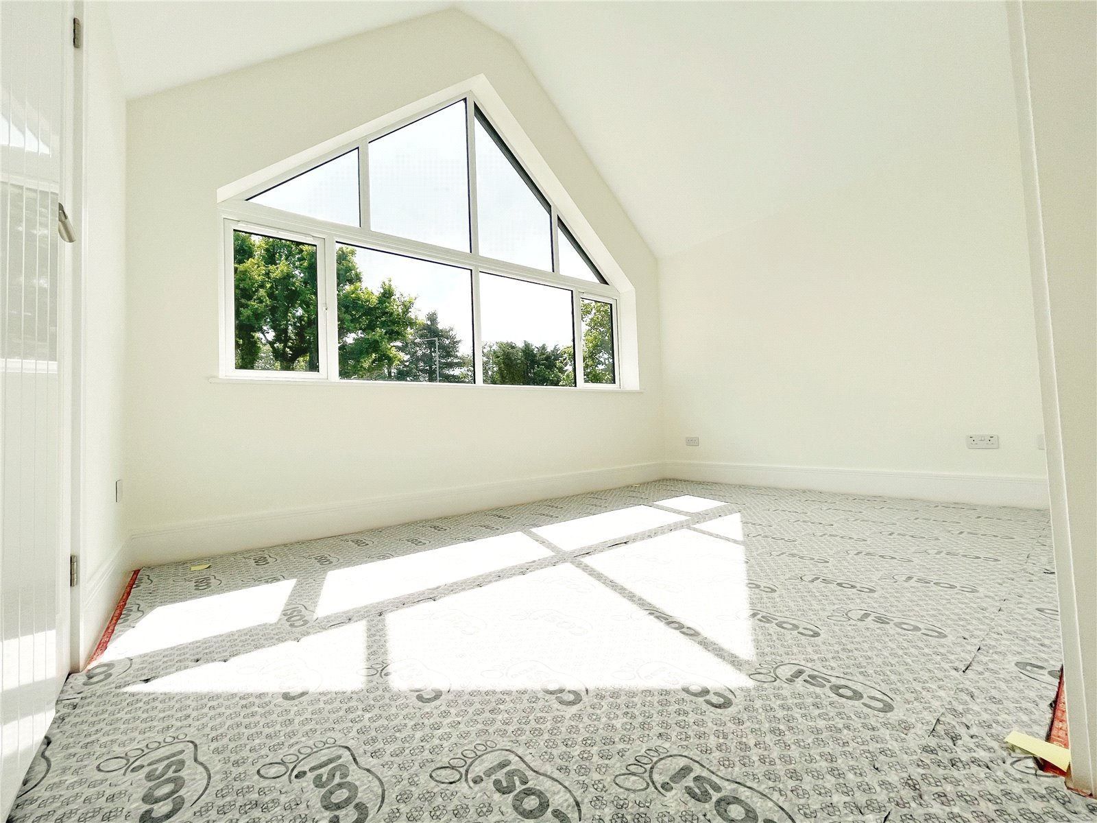 BEDROOM ONE MAIN SUITE WITH WALK IN DRESSING ROOM & ENSUITE LUXURY SHOWER ROOM: A double sized room with amazing feature vaulted ceilings, carpeted floors, twin skylights, double glazed windows with aspect and Juliet balcony over the rear landscaped garden, door to the walk-in dressing room.