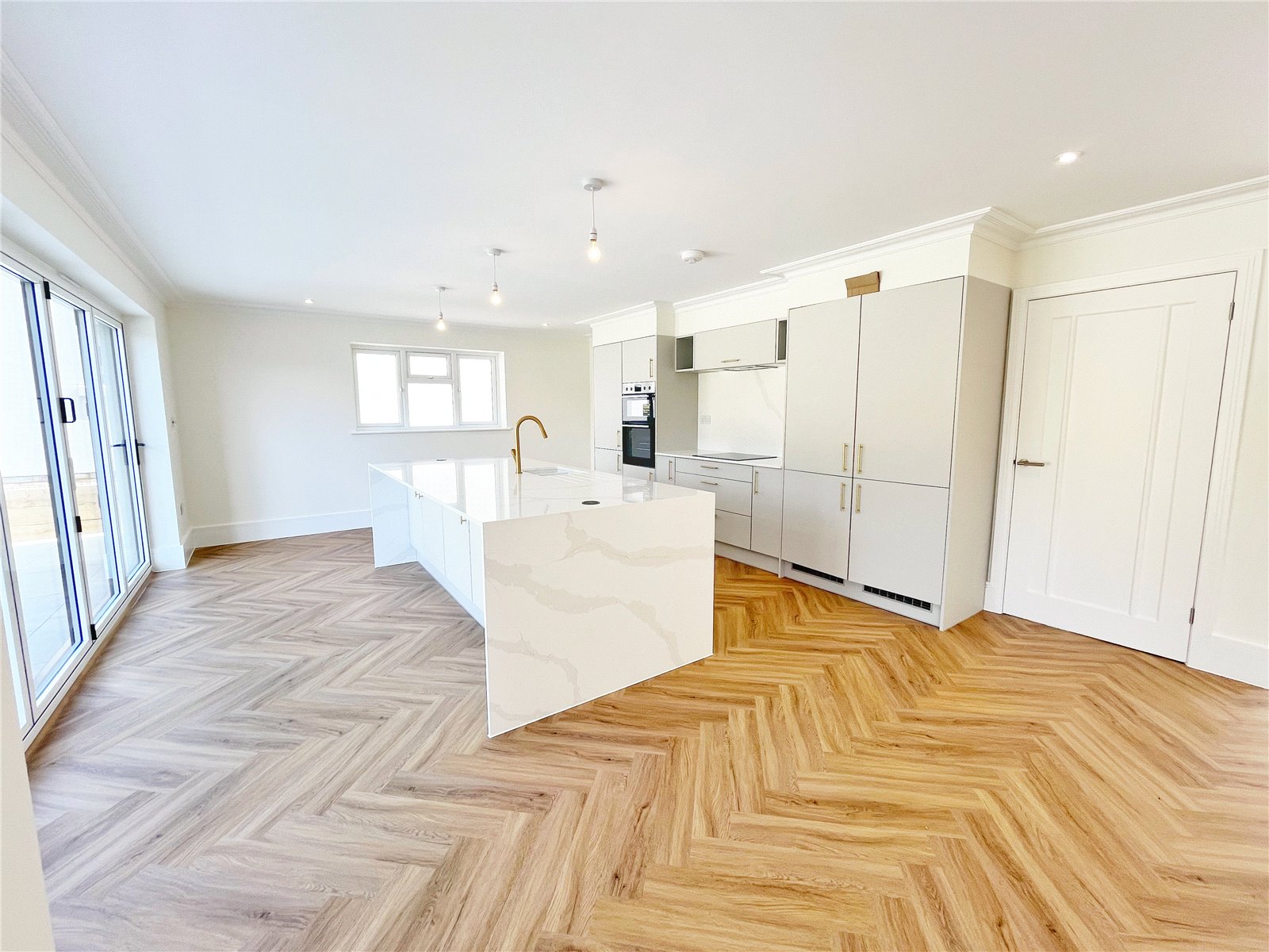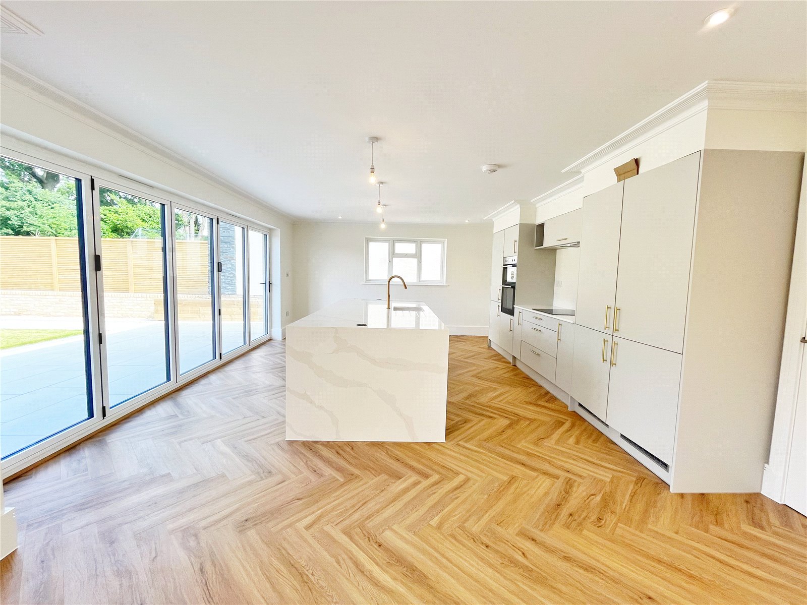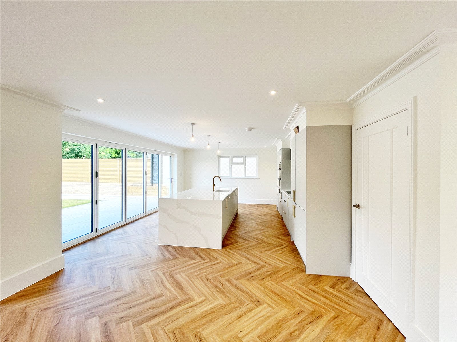 LUXURIOUS KITCHEN / BREAKFAST ROOM WITH ADJOINING OPEN PLAN DINING ROOM: Comprising of an extensive range of German styled sleek cupboard and base units with stone work surfaces over, wood styled flooring with underfloor heating, further matching large feature central island, 5 ring fitted hob, fitted sink unit with mixer tap and drainer, fitted oven and grill and fridge freezer, as well as integrated dishwasher, wine chiller, double glazed window with aspect to side, large breakfast bar and preparation area located at the central island, feature bi folding double glazed doors to rear garden opening to a large rear paved sun terrace for alfresco dining, door leading to separate utility room, open plan dining room with the continuation of the wood styled floors and underfloor heating.