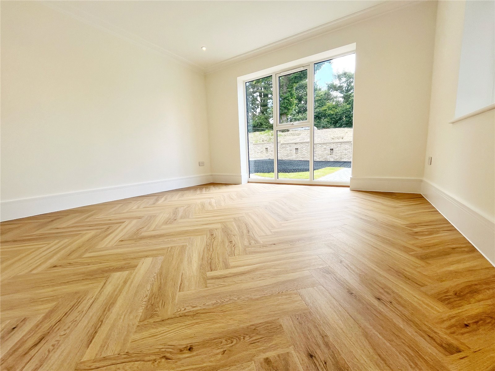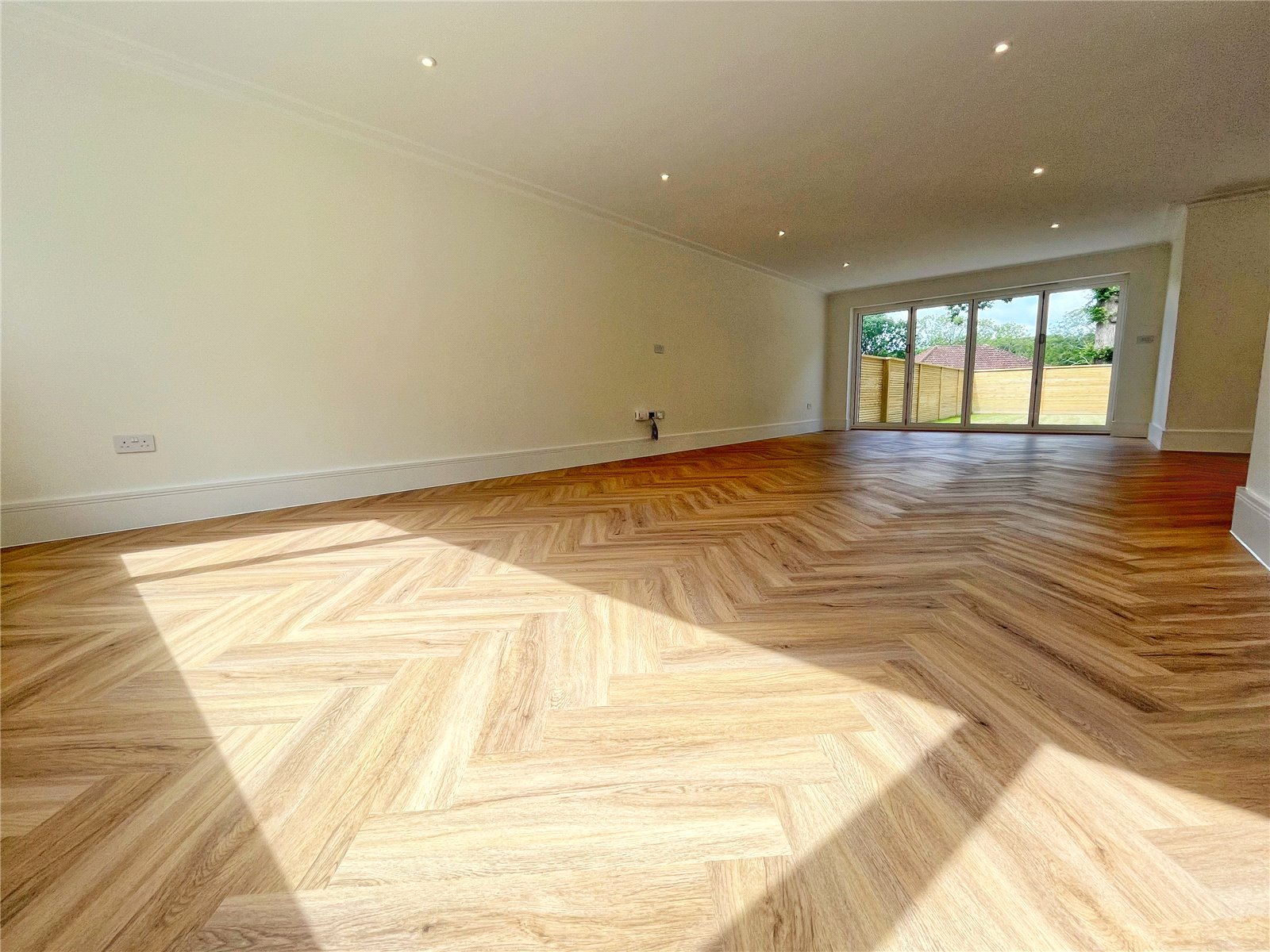 SITTING ROOM: A wonderful spacious and double aspect room with feature lighting and oak style flooring with underfloor heating, approached from the main reception hall via double feature doors, as well as from the open plan areas beyond the kitchen / breakfast room and open plan dining room. Feature bi-folding double-glazed doors with aspect to the rear landscaped gardens and opening to the paved rear sun terrace suitable for alfresco dining, further double-glazed window with aspect to the front landscaped gardens and driveway.