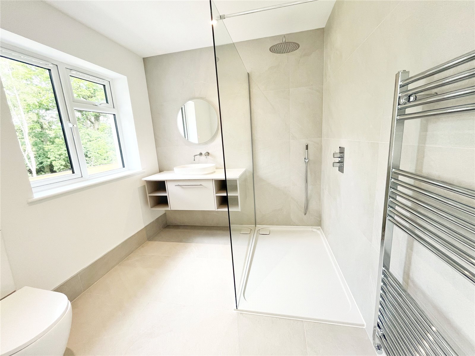 ENSUITE LUXURY SHOWER ROOM: With underfloor heating, tiled floor and large double shower with heavy glazed front, chrome shower control system, tiled walls, W.C., double glazed window, heated towel rail.