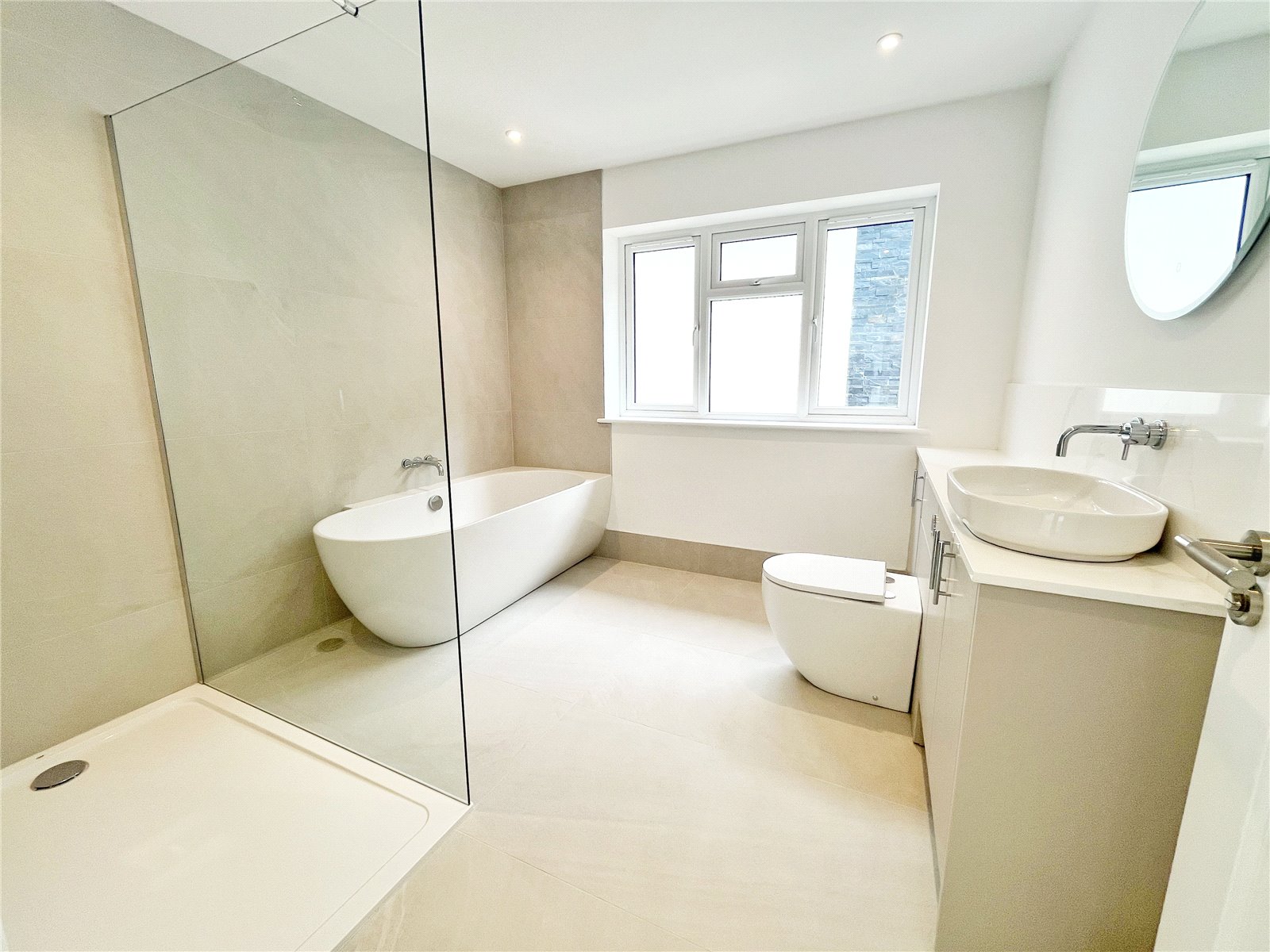 LUXURY FAMILY BATHROOM / SHOWER ROOM: Comprising of a fitted bath with shower attachment, W.C., wash basin with vanity storage, tiled floors, underfloor heating, separate shower with heavy glazed sides and shower control system, heated towel rail, double glazed window.