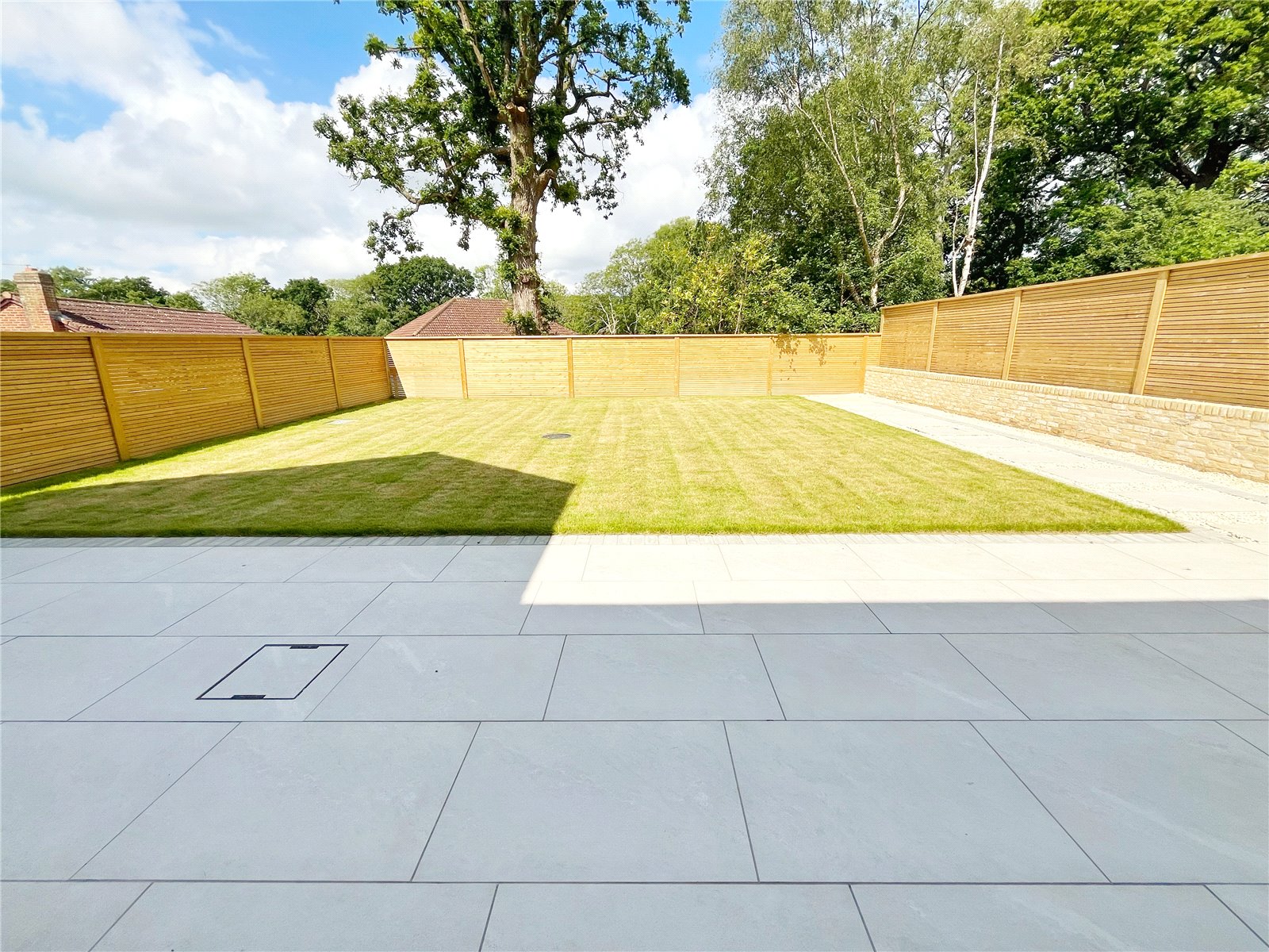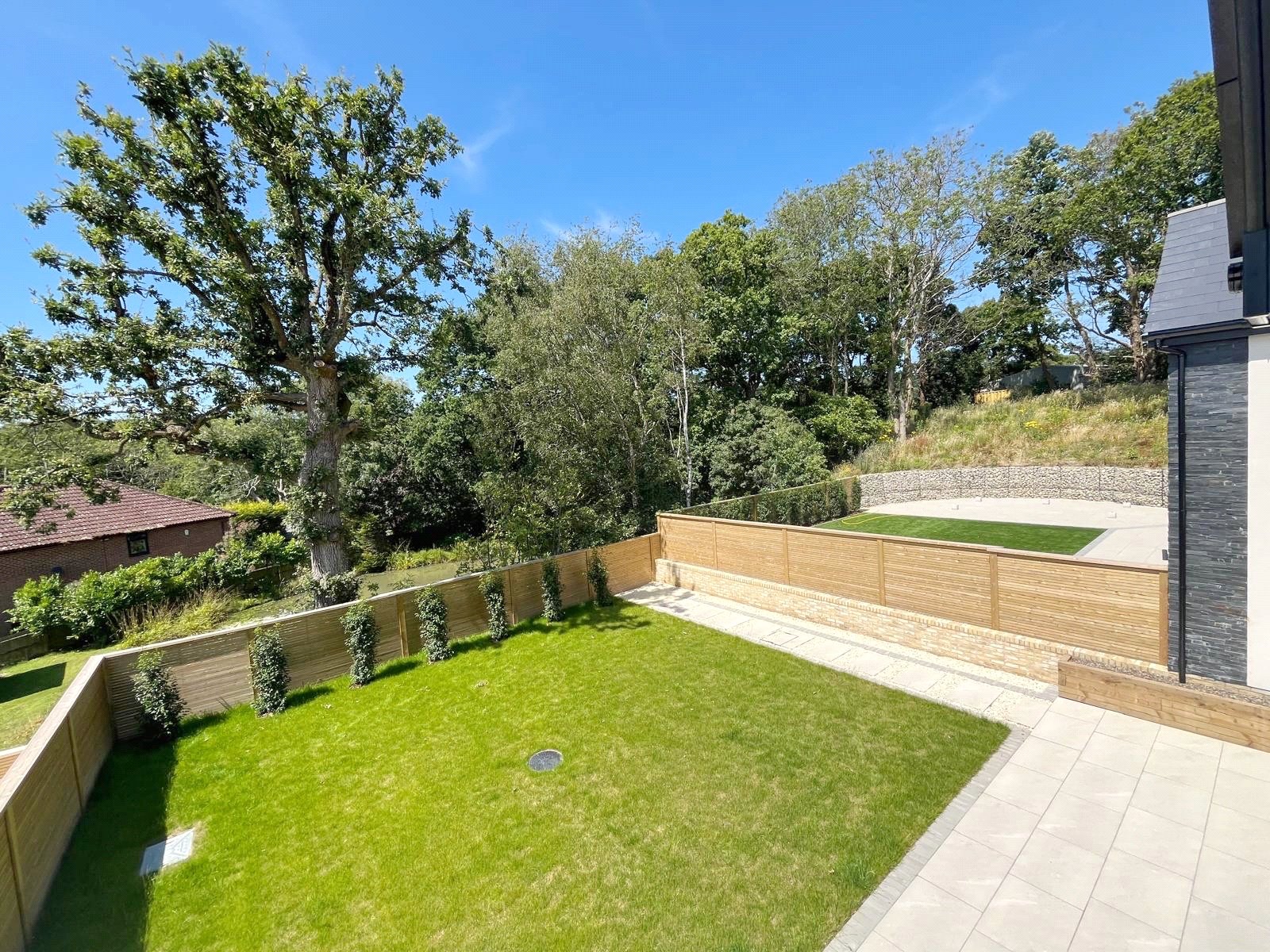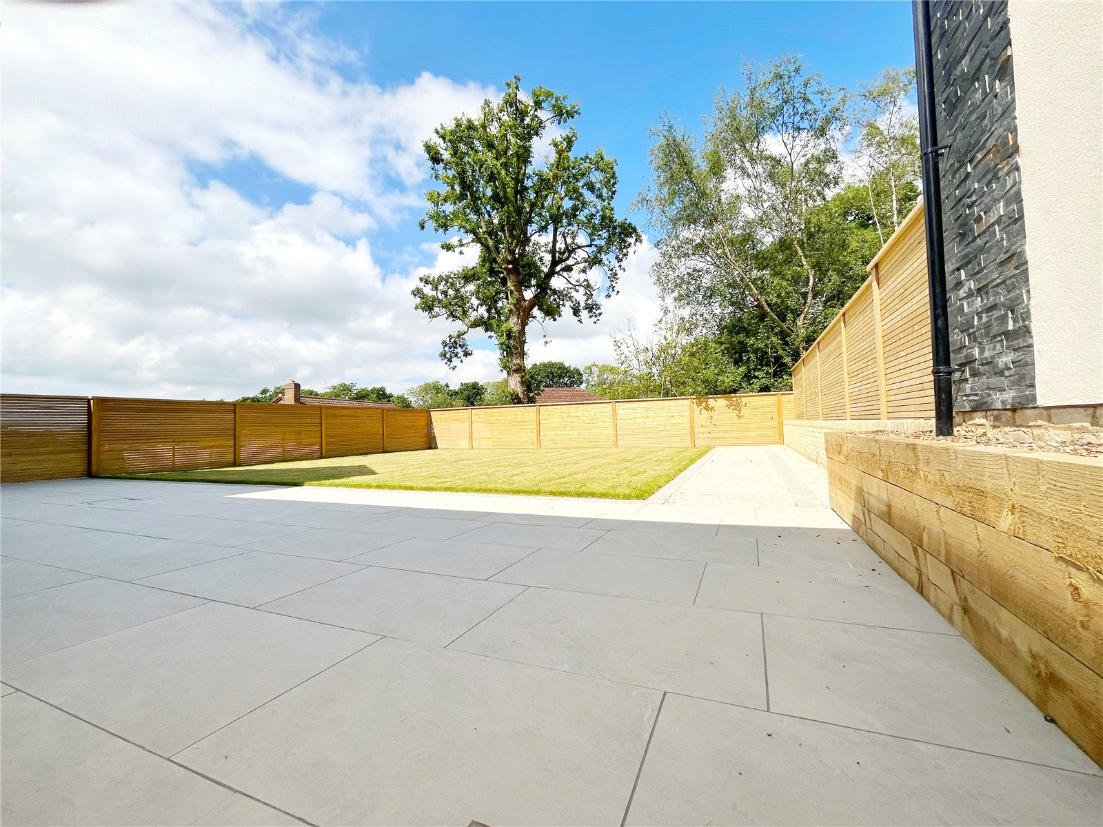 REAR LANDSCAPED GARDEN: With a sunny aspect and comprising of luxury paved sun terraces with a level lawned area, exterior lighting and a wonderful alfresco dining areas.