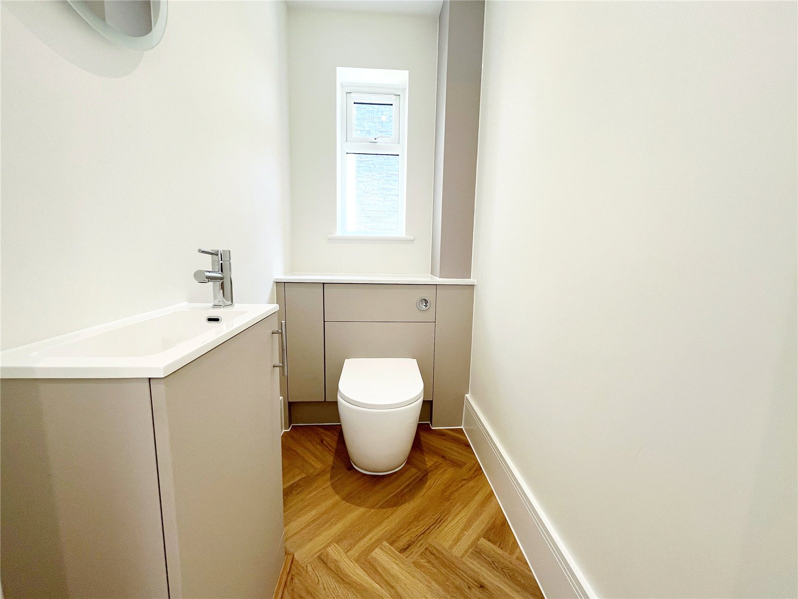 CLOAKROOM: Comprising of underfloor heating, a feature wash basin, W.C., double glazed window, extractor.