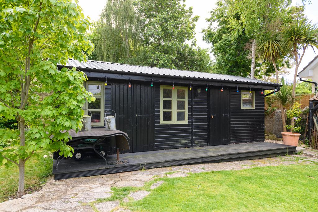 - Detached, fully insulated timber outbuilding with power and light, currently divided into a gym/hobbies room and separate shed/store area.