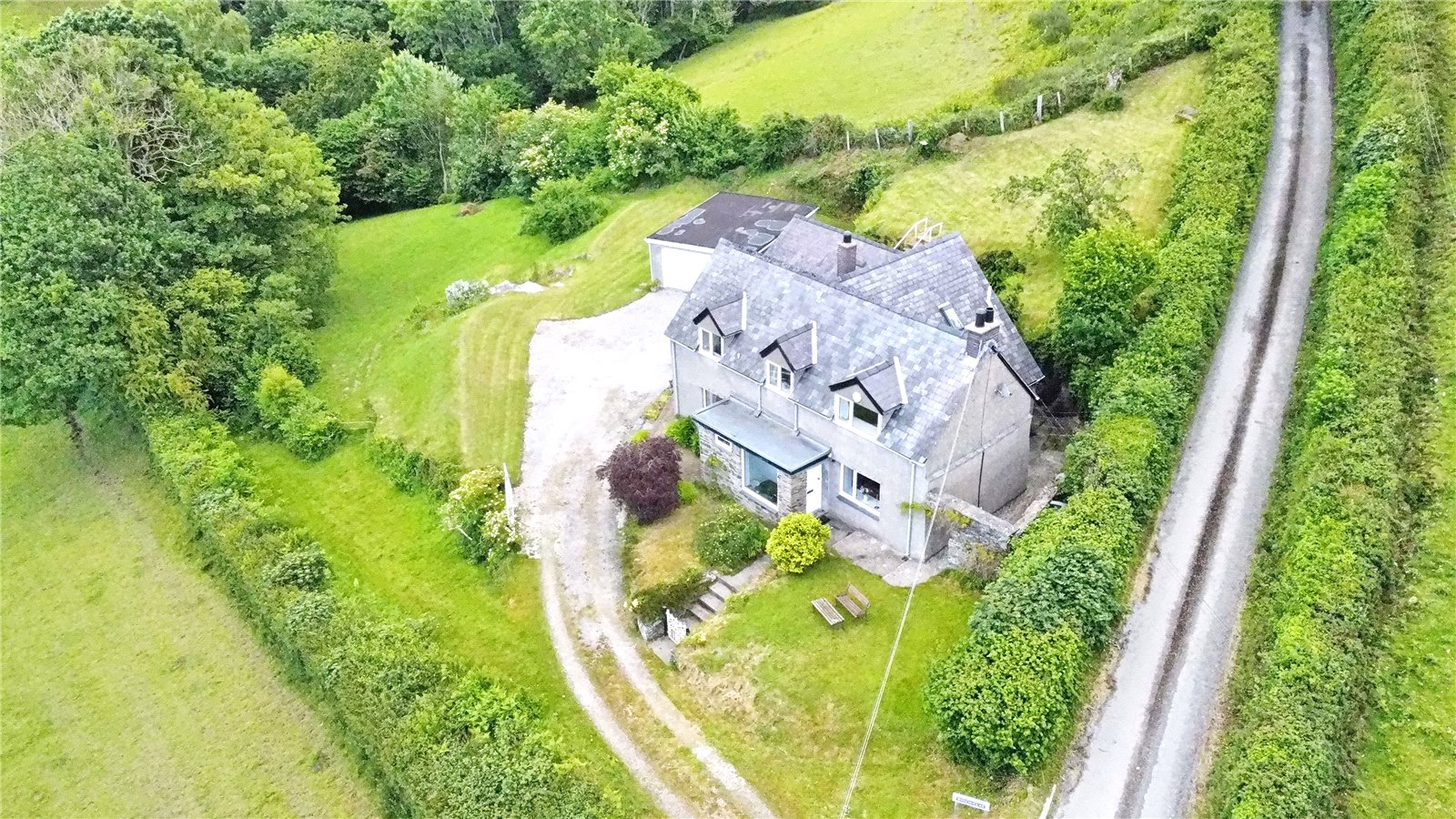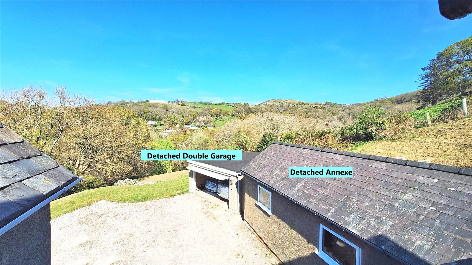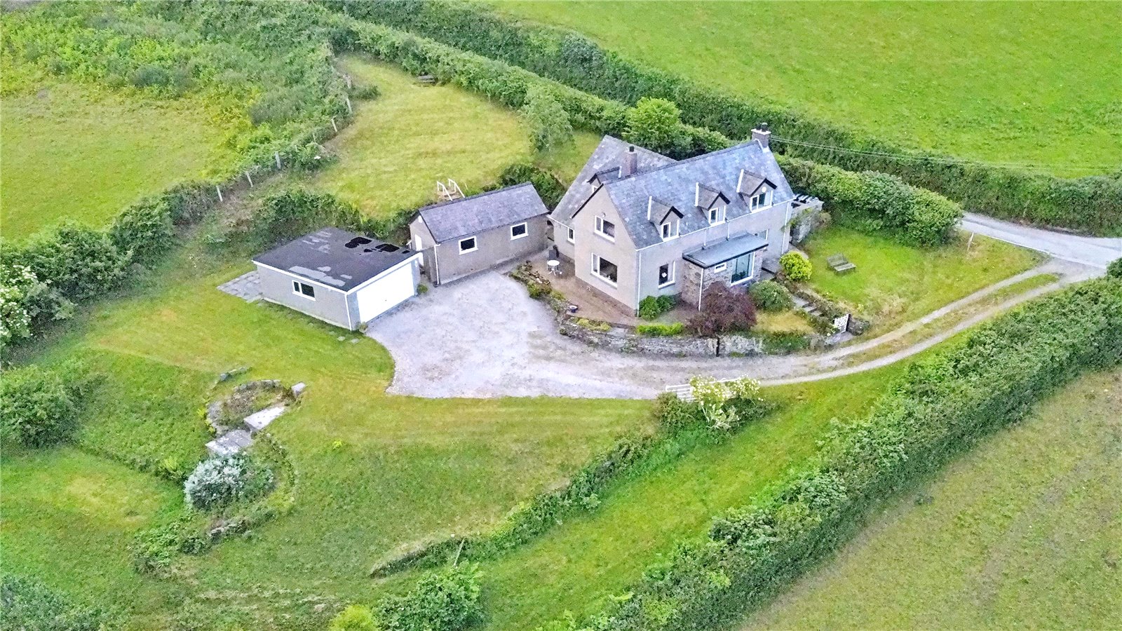 A detached 4 bedroom house with 2 reception rooms, a detached double garage, a detached 2 room annexe and approximately 1 acre of land.