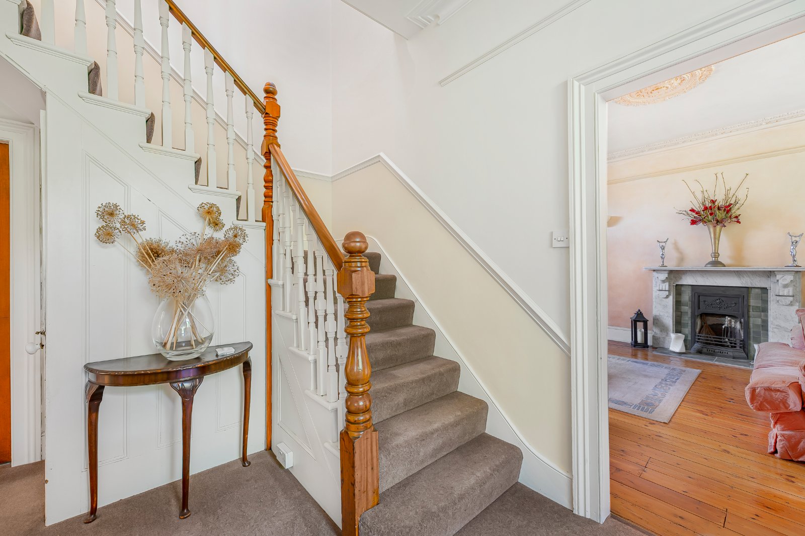 Many period features remain, including ornate cornicing, feature fireplaces, and traditional joinery, adding to the sense of grandeur and authenticity throughout. Natural light floods the interior thanks to large windows and a double-aspect design, while the spacious entrance hall and two generous reception rooms set an elegant tone for the rest of the house.