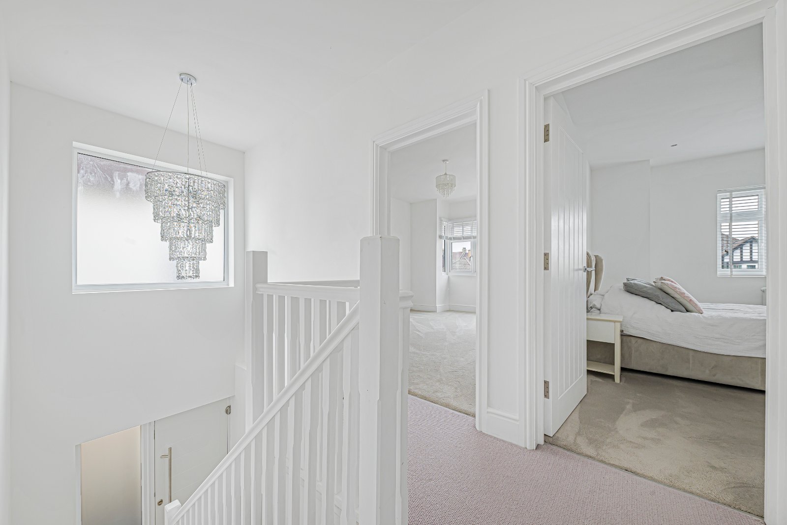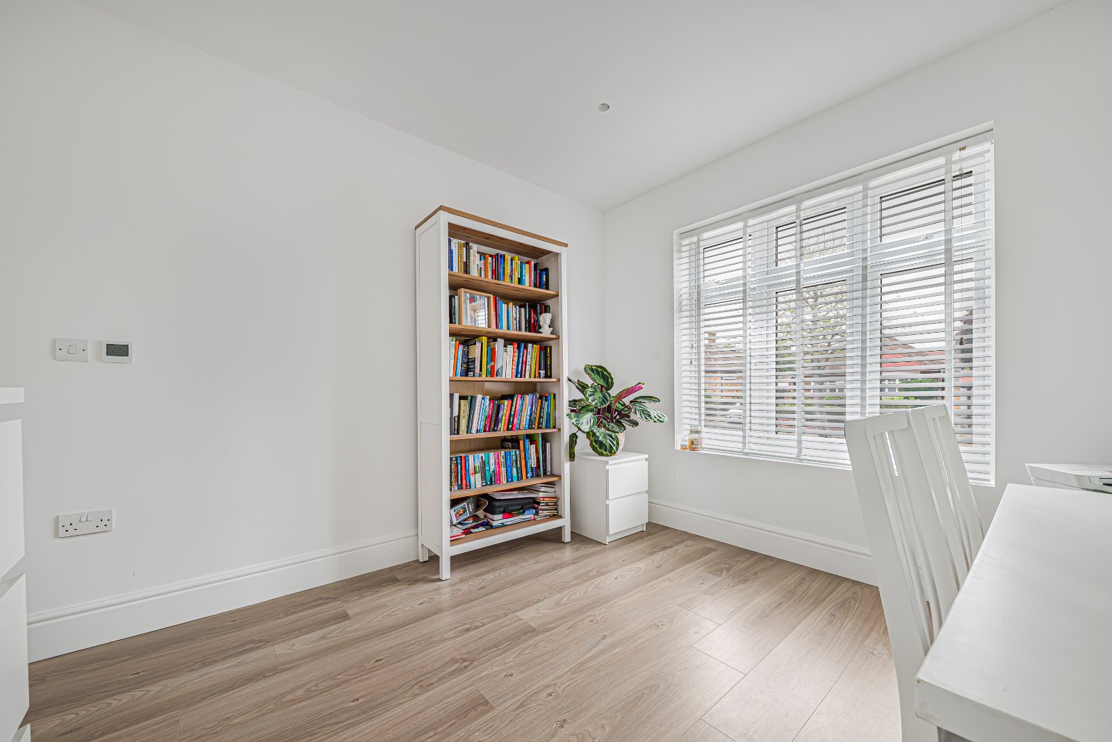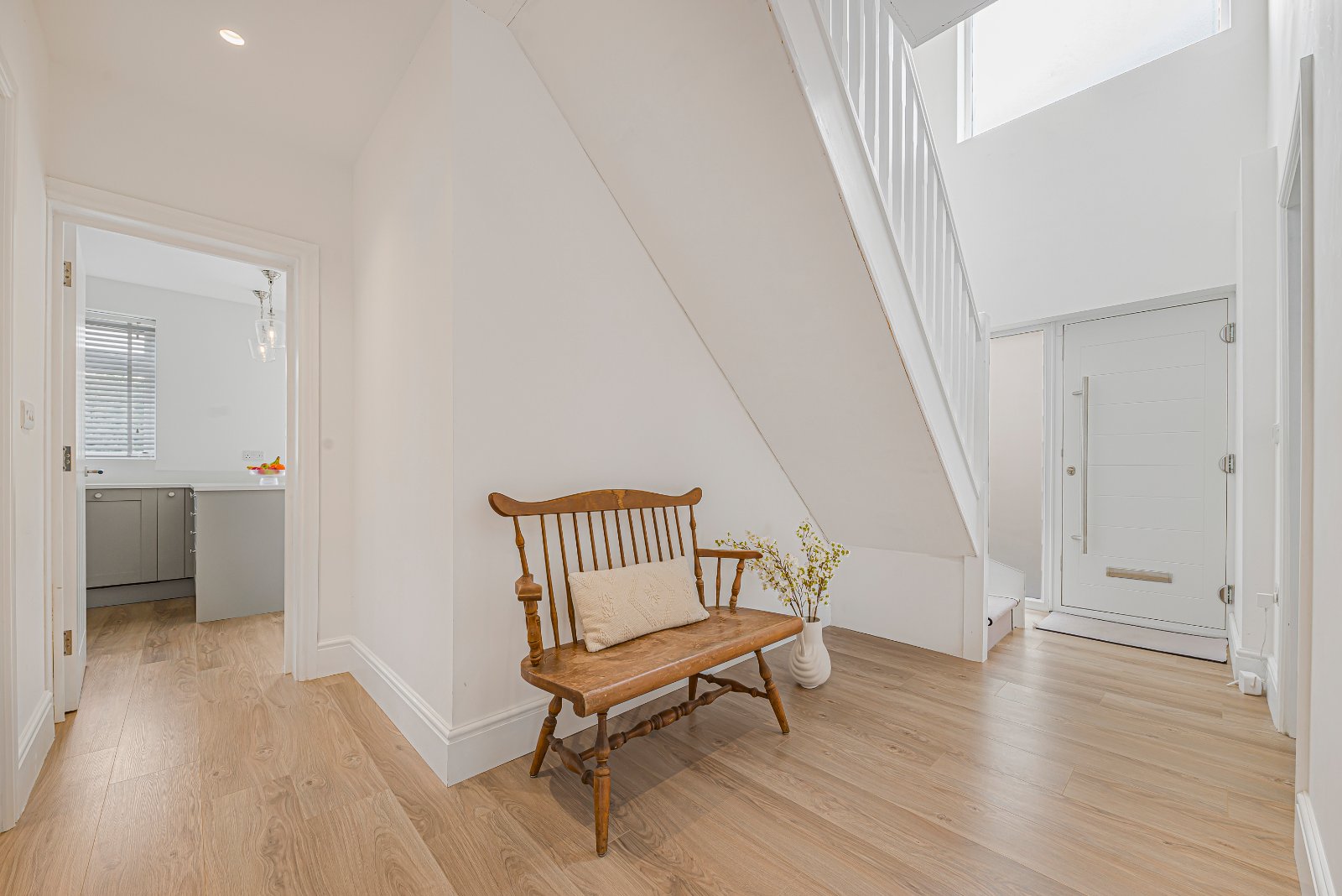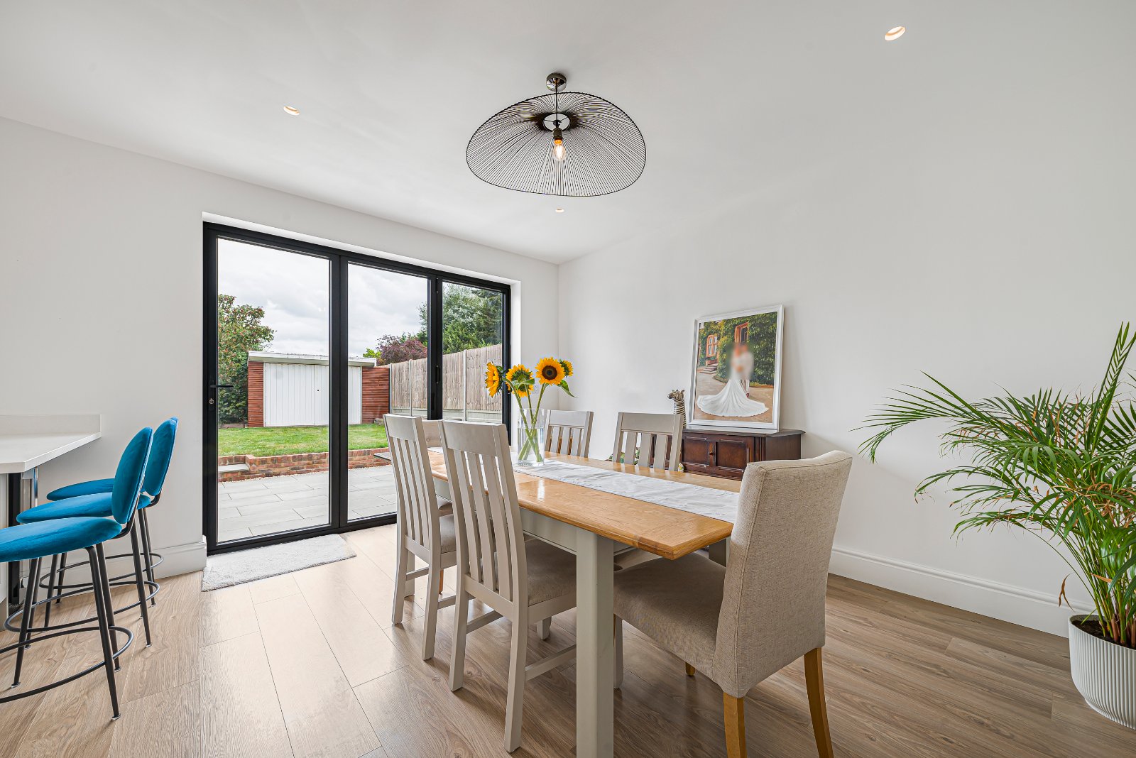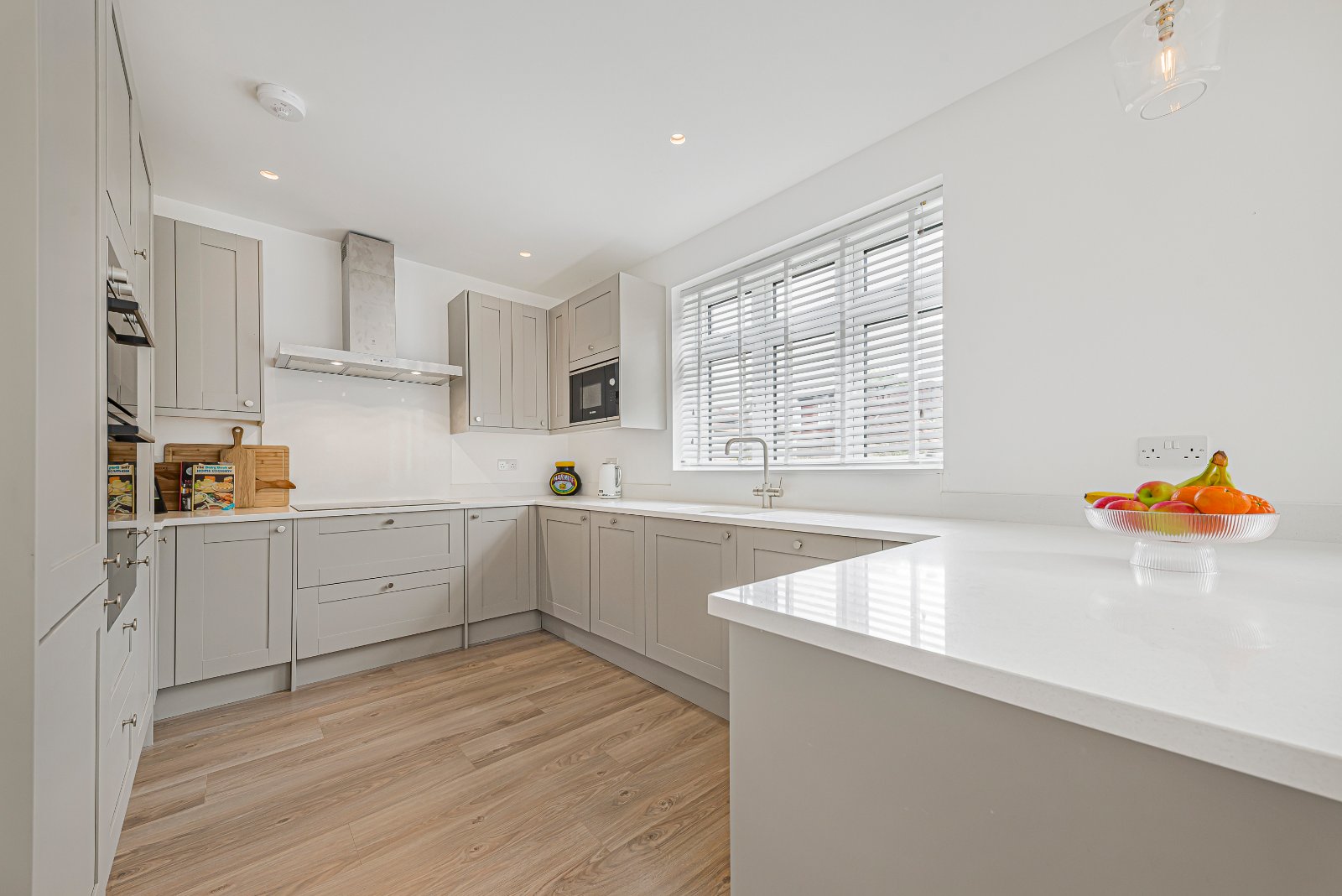 Inside, every detail has been carefully considered to provide generous and versatile living space. All bedrooms are proper doubles, offering ample room for growing families or visiting guests, and there are three beautifully appointed bathrooms, one of which is a private ensuite to the principal bedroom. The showpiece of the house is undoubtedly the expansive open-plan kitchen and dining area, designed with entertaining and everyday family living in mind. Flooded with natural light, it flows seamlessly onto a good sized family garden, perfect for both relaxation and gatherings. A separate utility room provides essential practicality, keeping the main living spaces clutter-free, while to the rear a purpose-built outbuilding offers excellent storage or potential for a home gym, office, or studio.