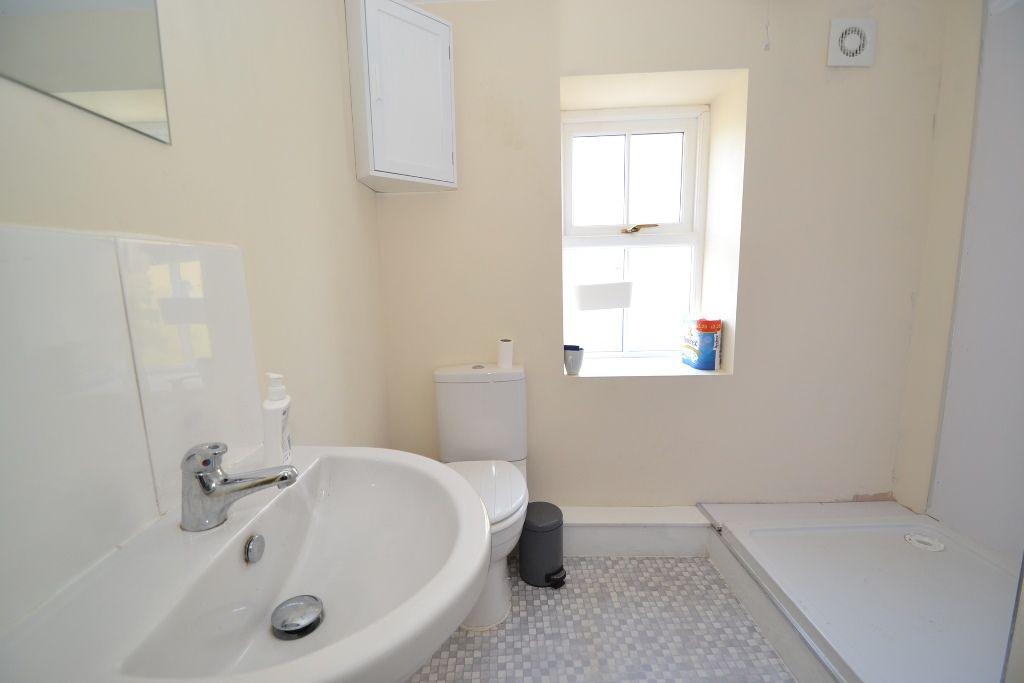 Shower Room: Walk in shower with a chrome thermostatically controlled unit, wc and wash basin in white, extractor, corner wall vanity unit, frosted dg window, ch radiator, linen cupboard.