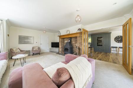 SITTING ROOM: Dual aspect with double glazed windows in a large square bay and double glazed French doors to garden. Feature brick surround with stone hearth and wood burning stove. Cornicing. Inset spotlights. Glazed wooden doors to:-