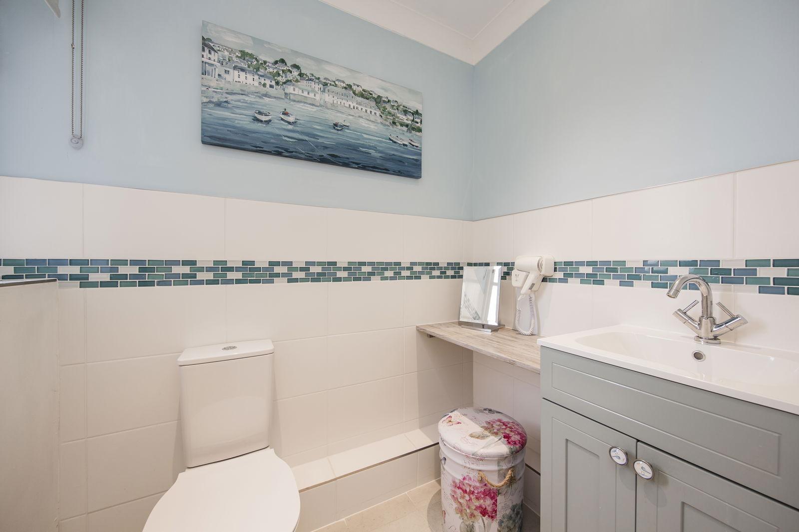 Double glazed window. WC. Wash basin with cupboards under. Part tiled walls. Tiled floor. Coved ceiling. Inset spotlights. Radiator.