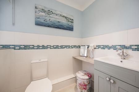 Double glazed window. Modern shower room with WC, pedestal wash basin, walk-in shower cubicle with thermostatic shower. Tiled floor. Part tiled walls. Coved ceiling. Inset spotlights. Extractor fan. Radiator.