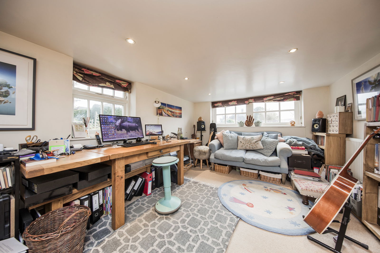 STUDY: Double glazed window overlooking the rear garden. Airing cupboard housing the hot water cylinder with slatted shelves above. Exposed beams.