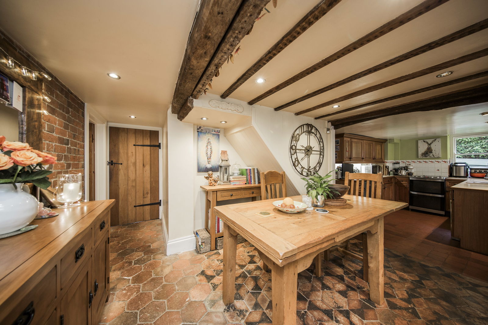 Dining area: Window overlooking the rear garden. Beamed ceiling and feature exposed brick wall. Inset spotlights. Tiled floor. Radiator.