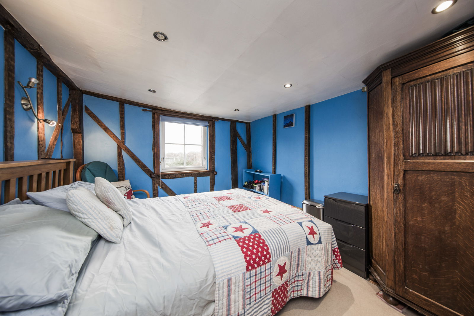BEDROOM TWO: Double glazed window with views between the roof tops. Beamed walls. Inset spotlights. Radiator.