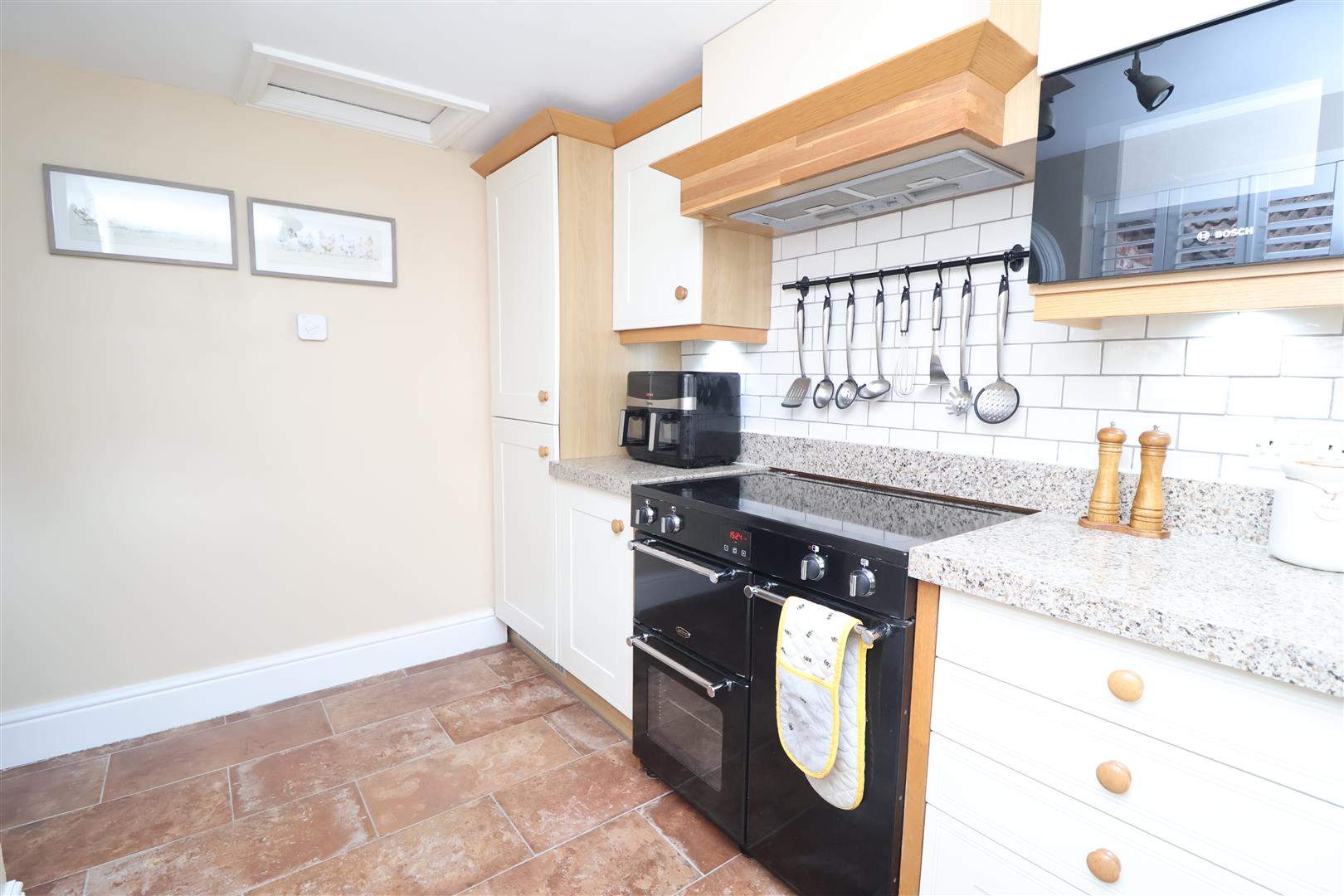 Kitchen - The kitchen is designed in a timeless country-style shaker finish, offering both functionality and charm. It features elegant quartz worktops and a classic Belfast sink, complemented by a fully integrated fridge, freezer, dishwasher, and microwave. There is a designated space for a Rangemaster cooker, complete with a fitted extractor hood above, ideal for those who enjoy cooking and entertaining. Natural light enters the space through bespoke wooden sash windows to the rear elevation, carefully crafted to match the character of the listed building. The floor is laid with stone-effect tiles, complete with underfloor heating, providing warmth and style throughout.