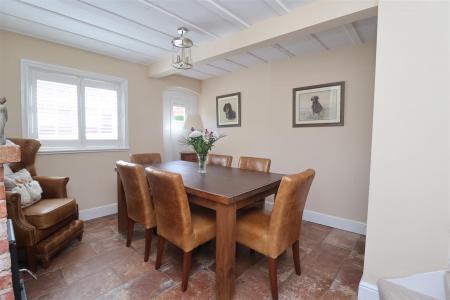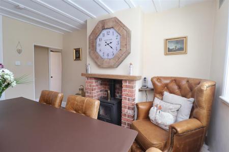Dining Room - The dining room is full of character, featuring exposed ceiling beams, bespoke wooden sash windows, and a newly fitted wooden door that enhances the traditional aesthetic. The room is warmed by tiled flooring with underfloor heating and a charming log burner set within a rustic brick surround, topped with a solid wood beam mantel. A door to the side provides access to the first floor, adding to the room's practical layout and inviting atmosphere.