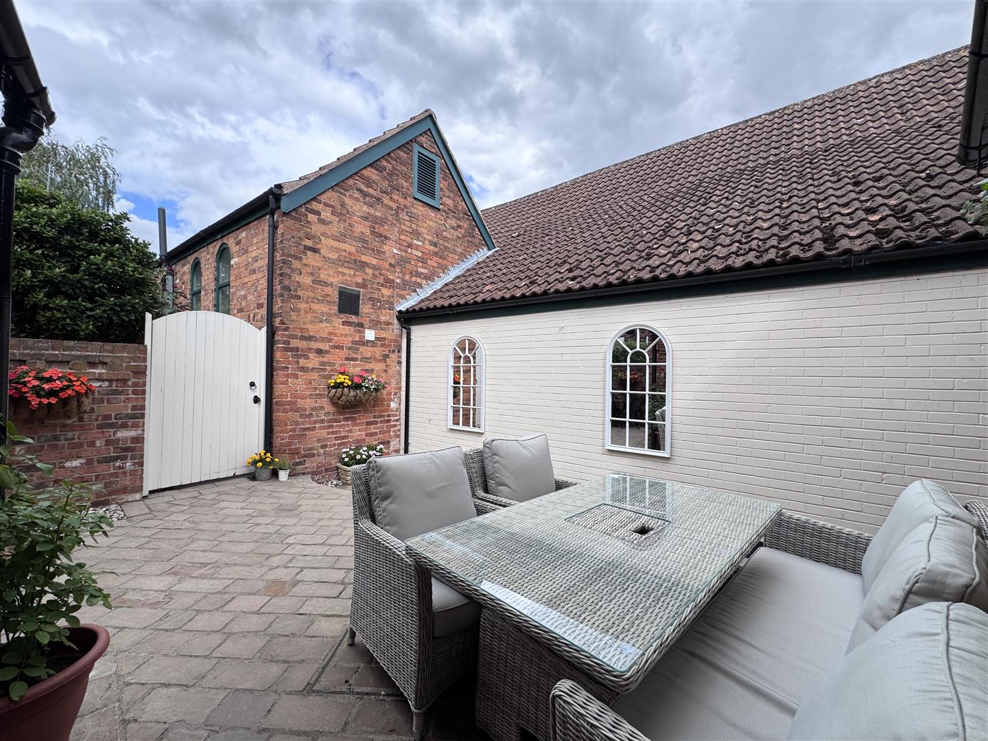Rear Courtyard - The rear courtyard has been fully paved with small Indian stone-style patios, bordered by neat gravel edging for a tidy, low-maintenance outdoor space. Additionally, there is a useful outbuilding equipped with plumbing, electricity, and lighting, offering versatile potential for a workshop, studio, or utility area.