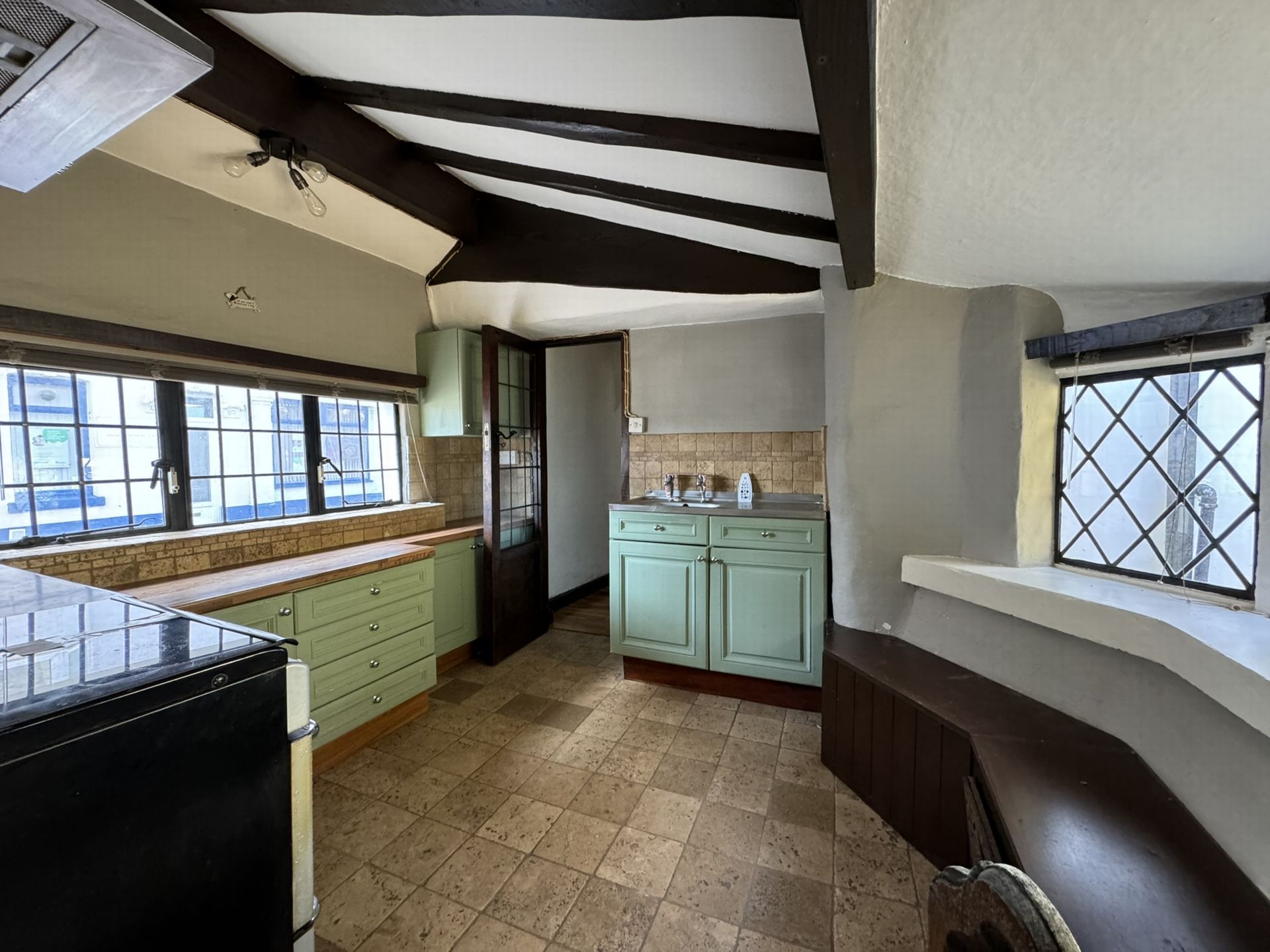 A staircase from the sitting room leads up to the main bedroom which is an interesting double room with beams and feature fireplace with timber mantle and slate hearth.