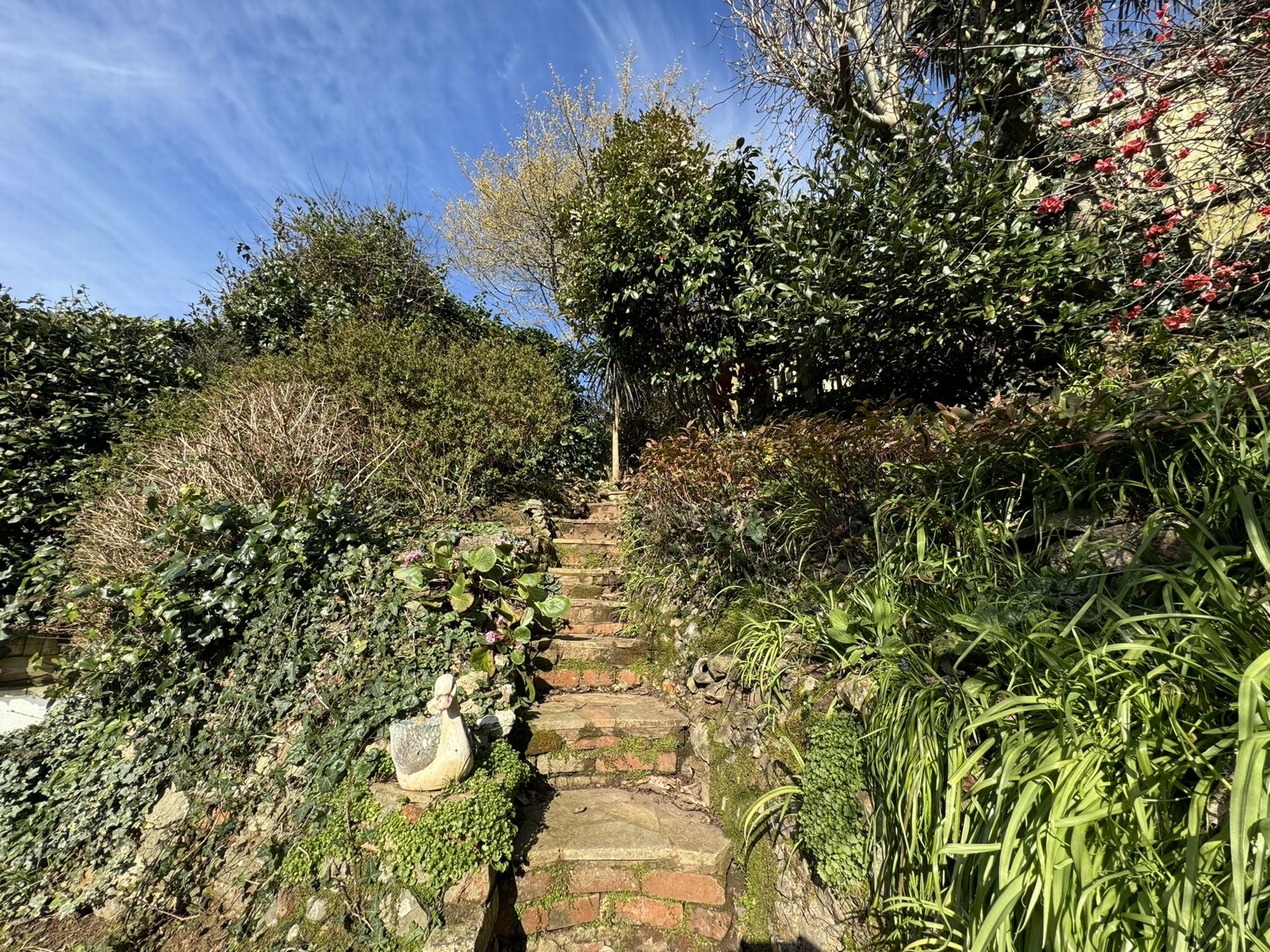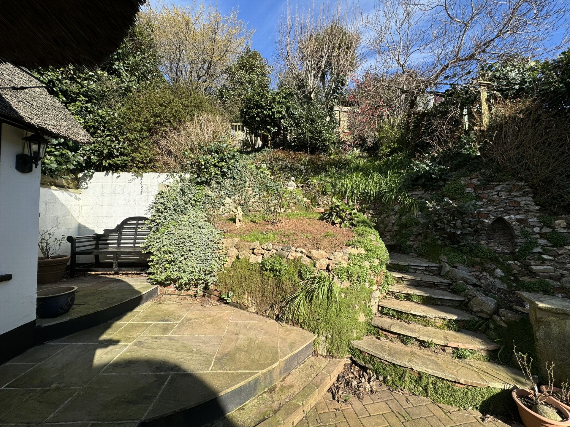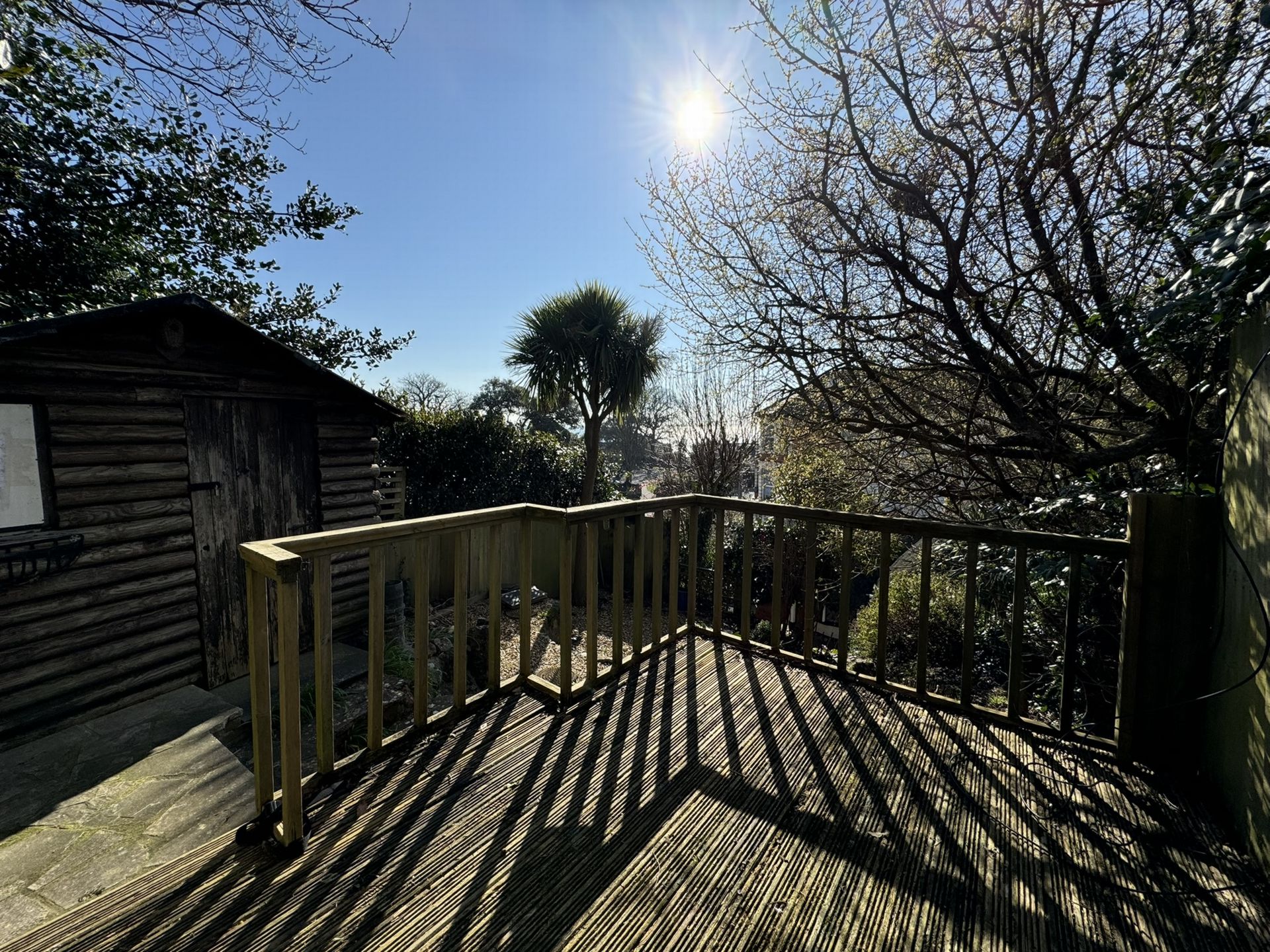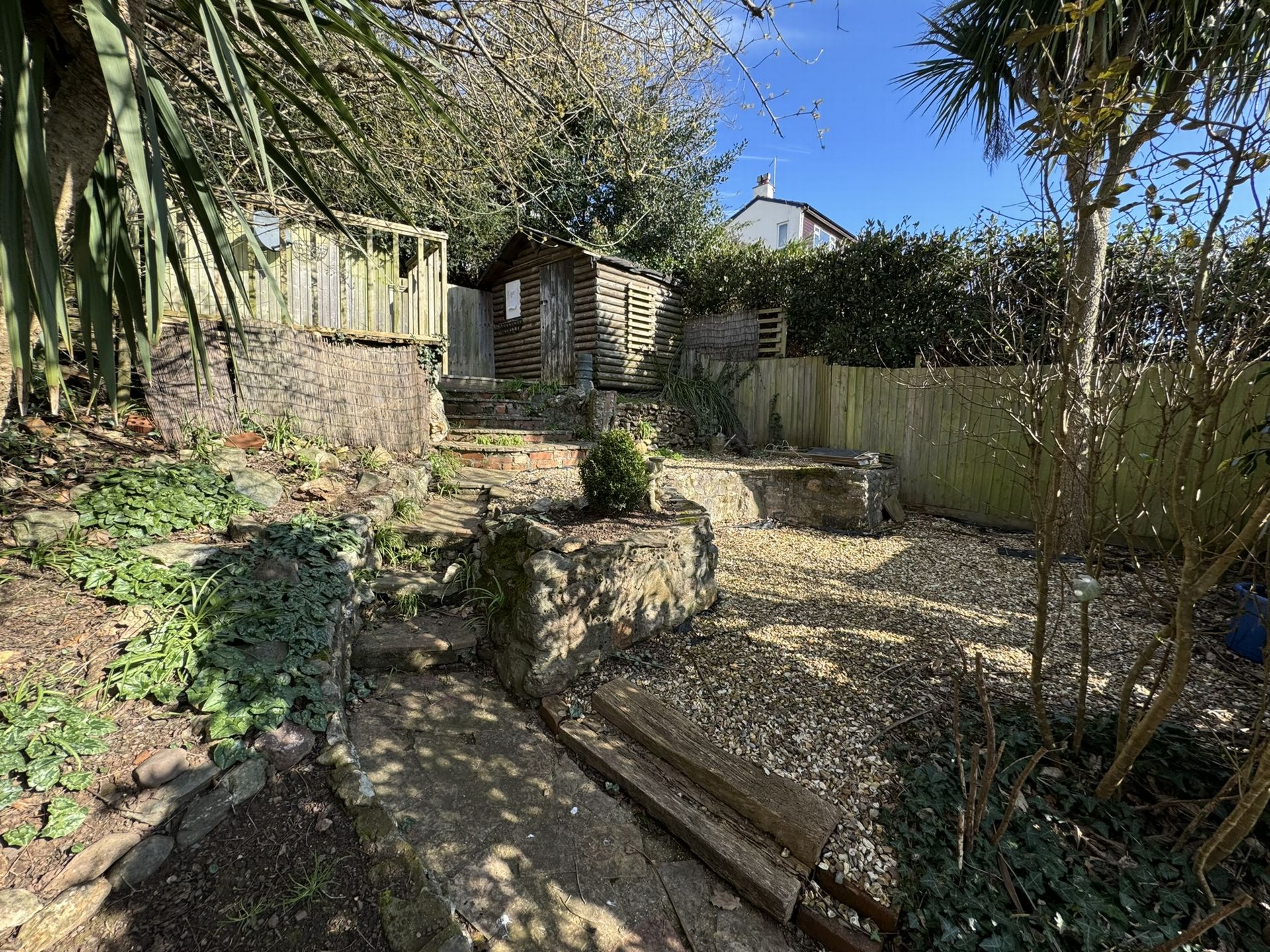 Outside: The garden rises to the rear of the property where it enjoys a sunny aspect from a decked area where there is also a small log cabin. There are a variety of mature shrubs and plants and at a lower level is a paved patio area.