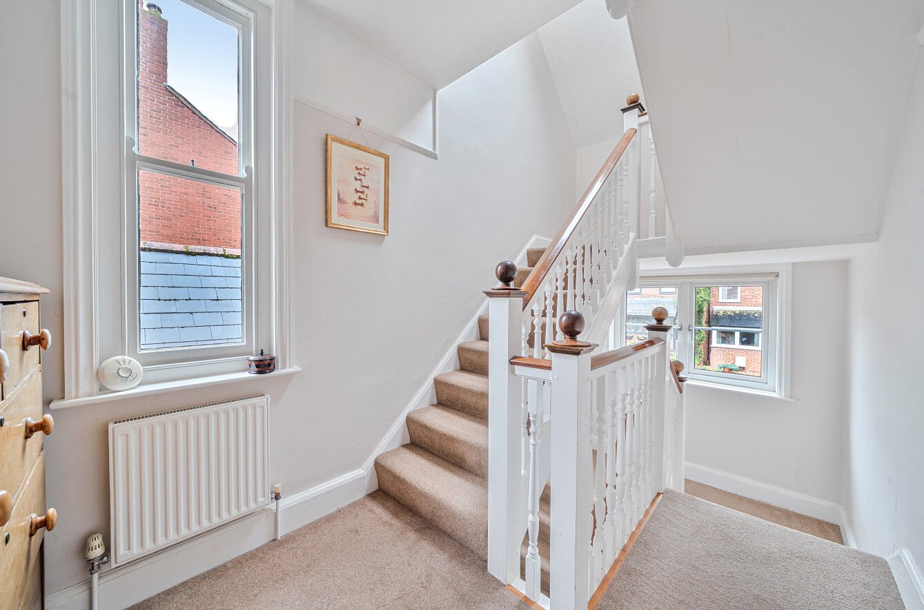 Extending to approximately 1,825 sq. ft, the light-filled interior offers well-proportioned rooms and flexible living space arranged over three floors. Rooms include a Sitting Room, separate Dining Room and a modern Kitchen with access to a Breakfast Room with underfloor heating, a gas fired Aga and bi-fold doors providing access to the rear garden. There is also a ground floor WC, whilst on the upper floors are five bedrooms, a family bathroom and 2 Shower Rooms. The house is light and spacious with ample room for those working from home.