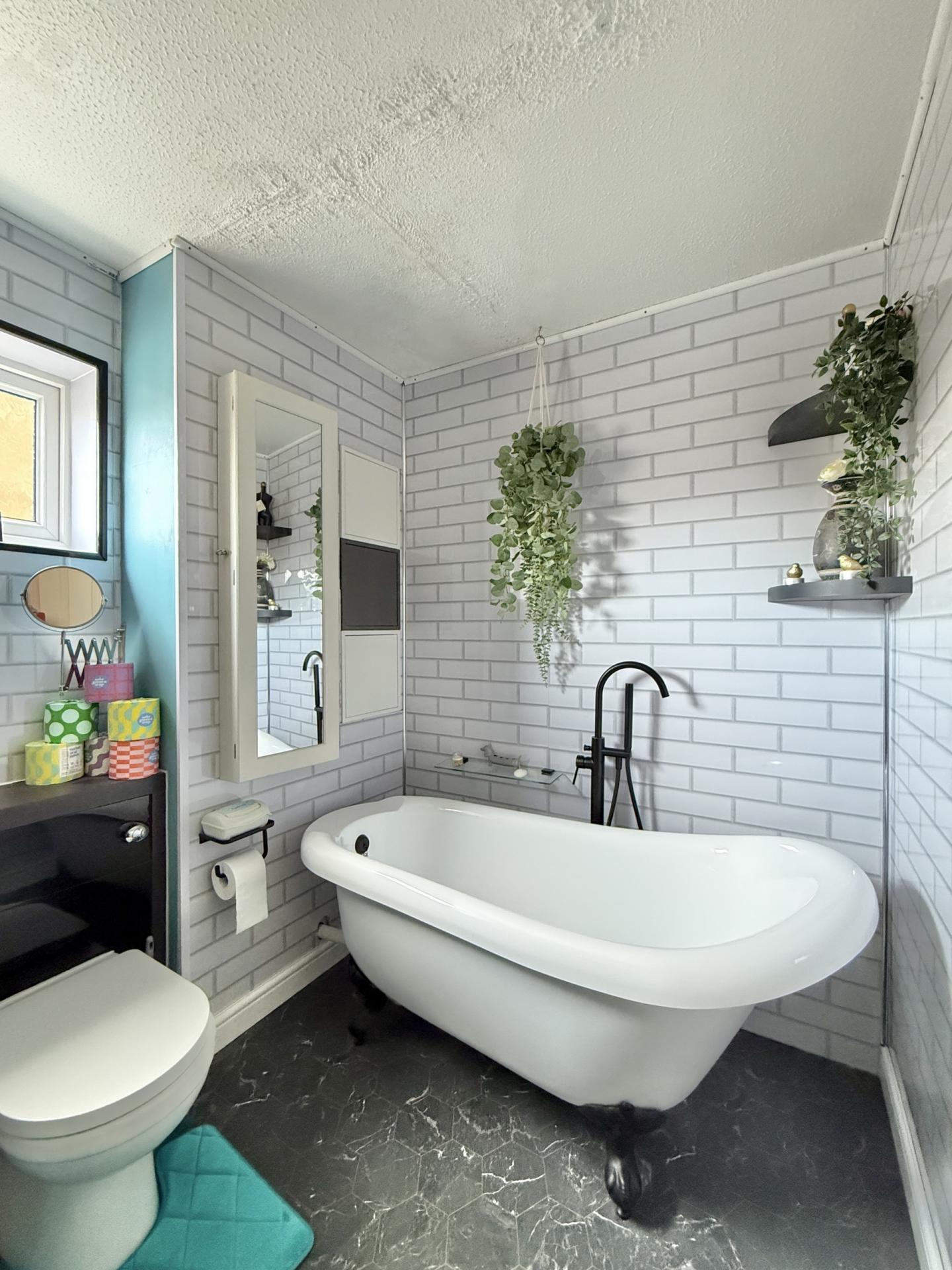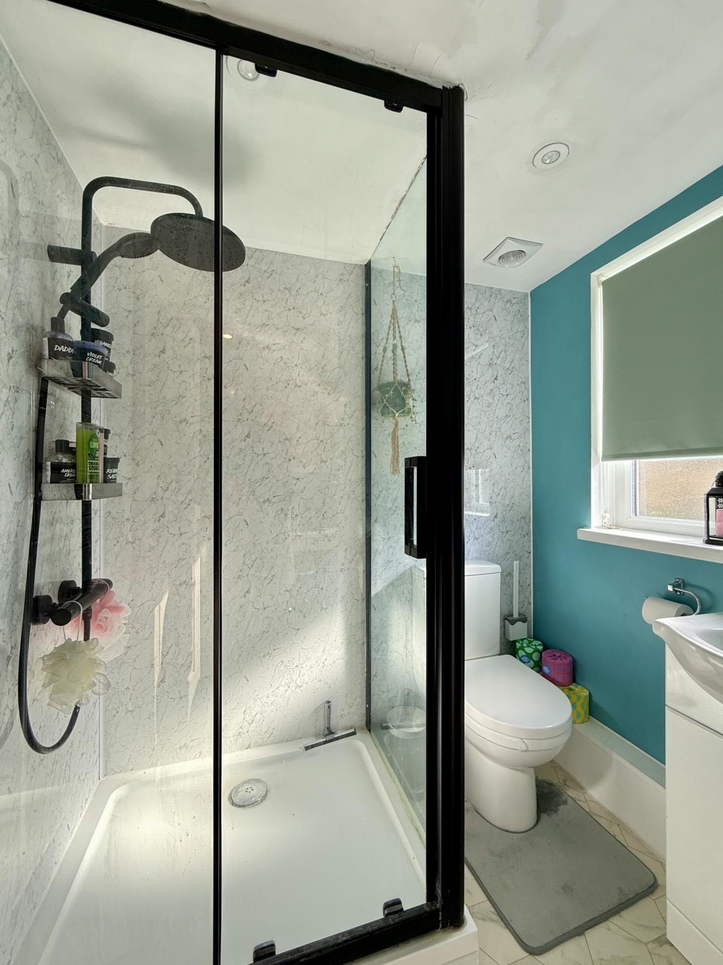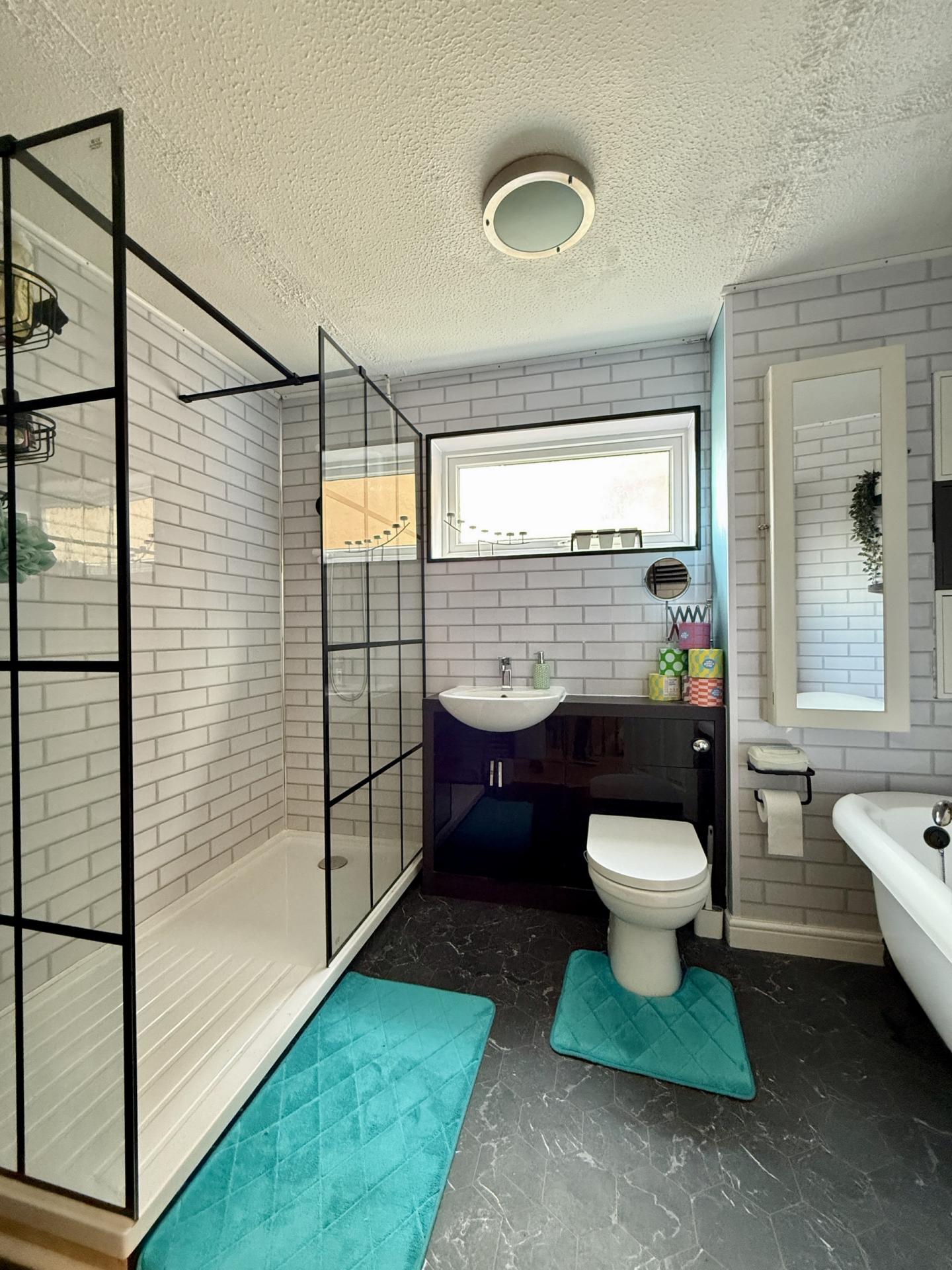 BATHROOM: Walk in shower, wash hand basin, claw foot bath tub, radiator, double glazed window to the side.