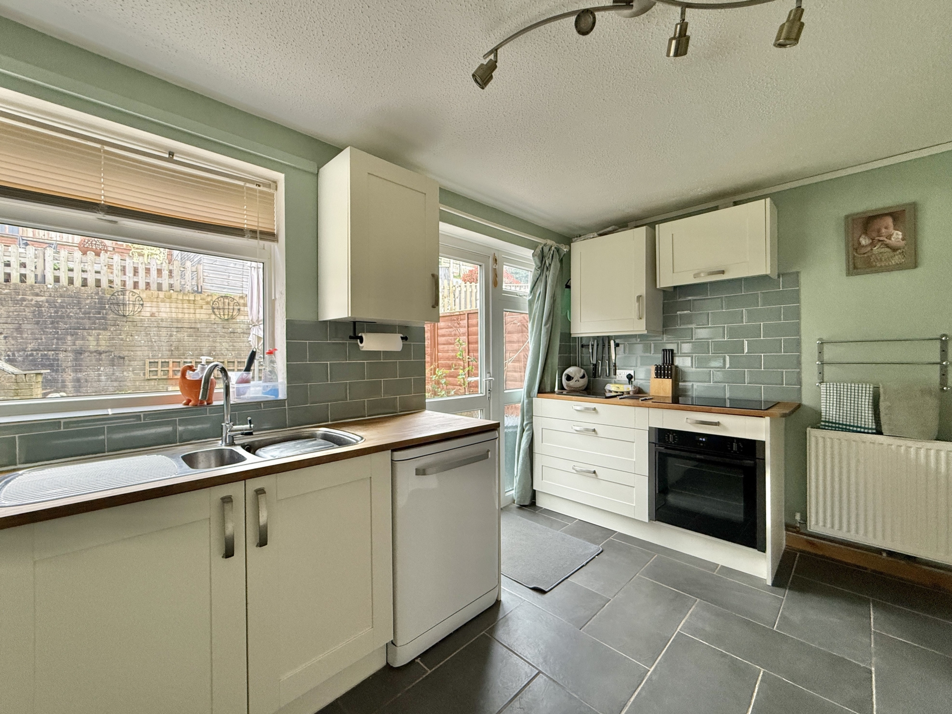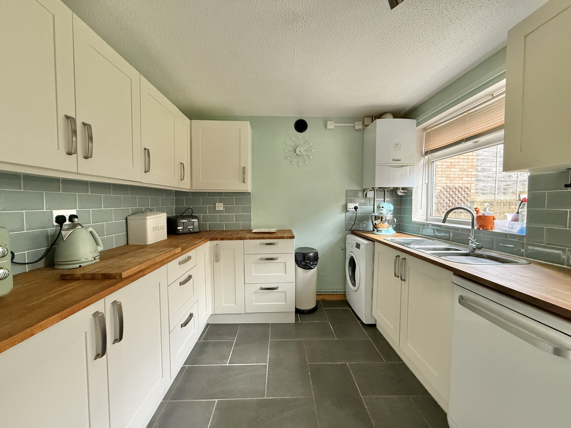 KITCHEN: 3.9m x 2.8m (12'10" x 9'2"), Double glazed window to the rear, double glazed door to the rear garden, base cupboard and drawers with worktop over, built in oven and hob, sink and drainer, space for washing machine, space for fridge freezer, wall mounted cupboards, wall mounted boiler, radiator,