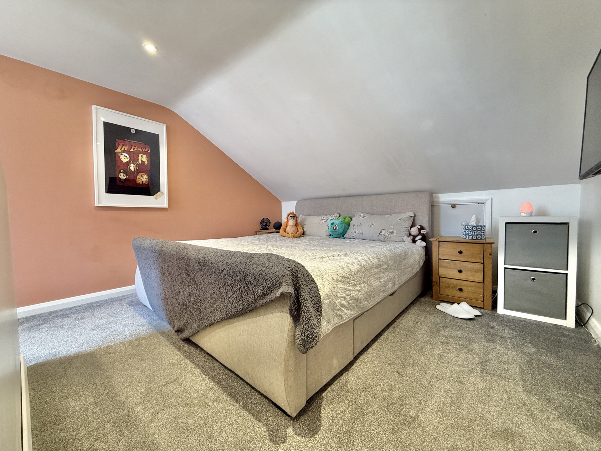 BEDROOM 1: 5.9m x 3.4m (19'4" x 11'2"), Radiator, eaves storage, part slopping ceiling, double glazed window to the rear, door to..