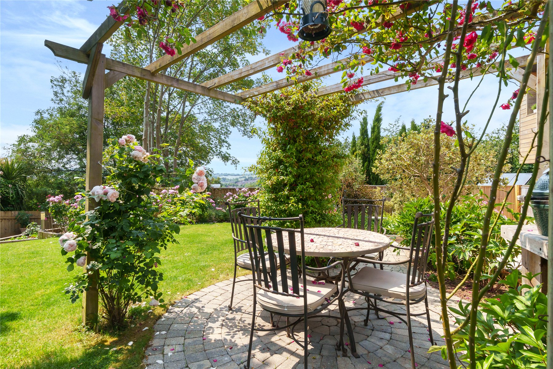The gardens are a real highlight, offering a high degree of privacy and seclusion with a southerly orientation. The beautifully landscaped grounds include well-maintained lawns, planted borders, and mature boundaries. There is a circular paved patio with a pergola, ideal for outdoor dining, as well as a large sun patio adjacent to the house and a raised vegetable bed. Under-house storage is accessible via doors at both the front and rear of the property. Gates and pathways lead to further lawned areas, a raised sun deck, and a gravelled drying area. The air-source heat pump is positioned at the rear of the house.