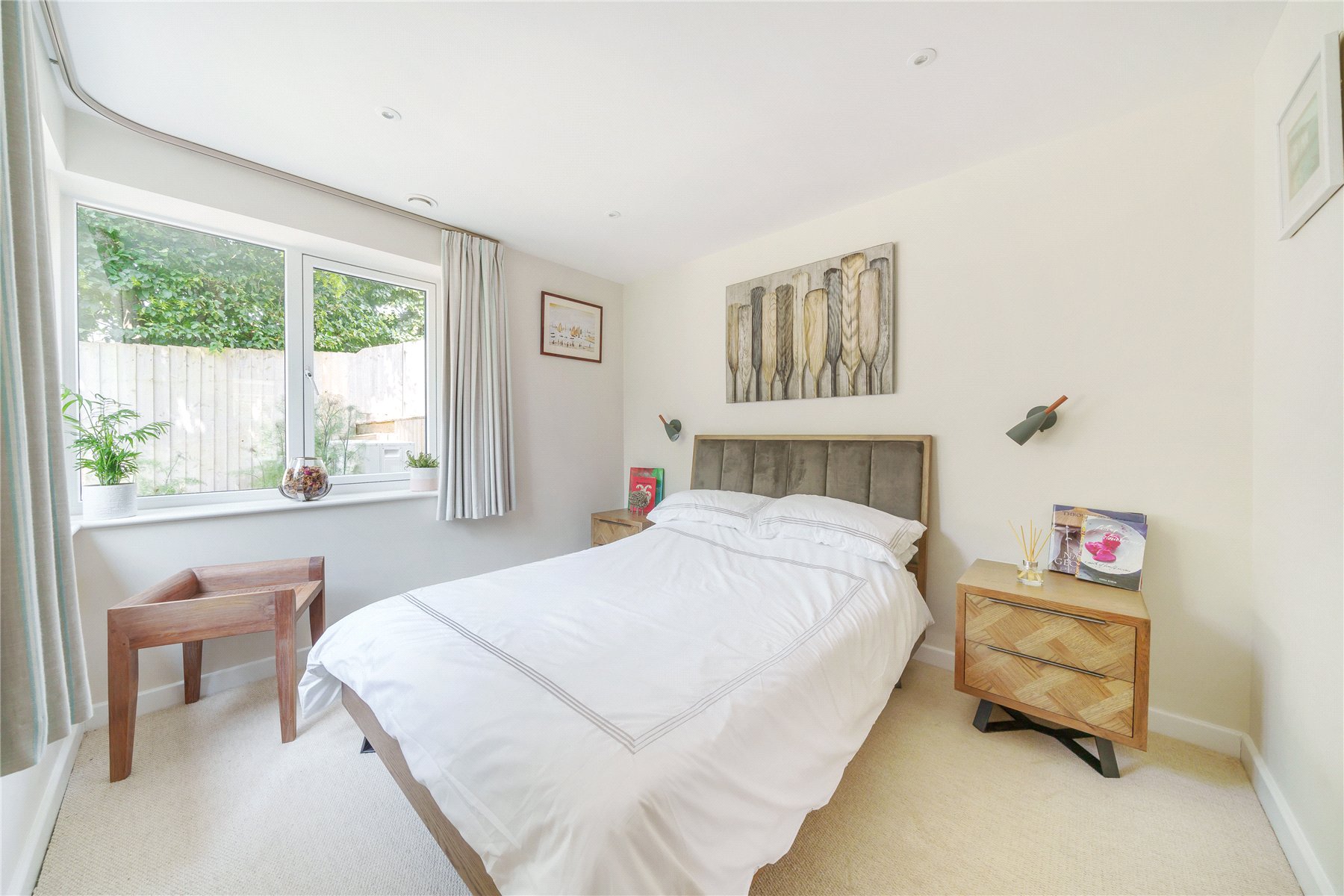The Principal Bedroom is generously sized, with double-glazed doors opening directly to the gardens. A spacious walk-in closet offers extensive storage with shelving units and hanging rails. The room also benefits from an under-stair storage cupboard and ceiling spotlights.