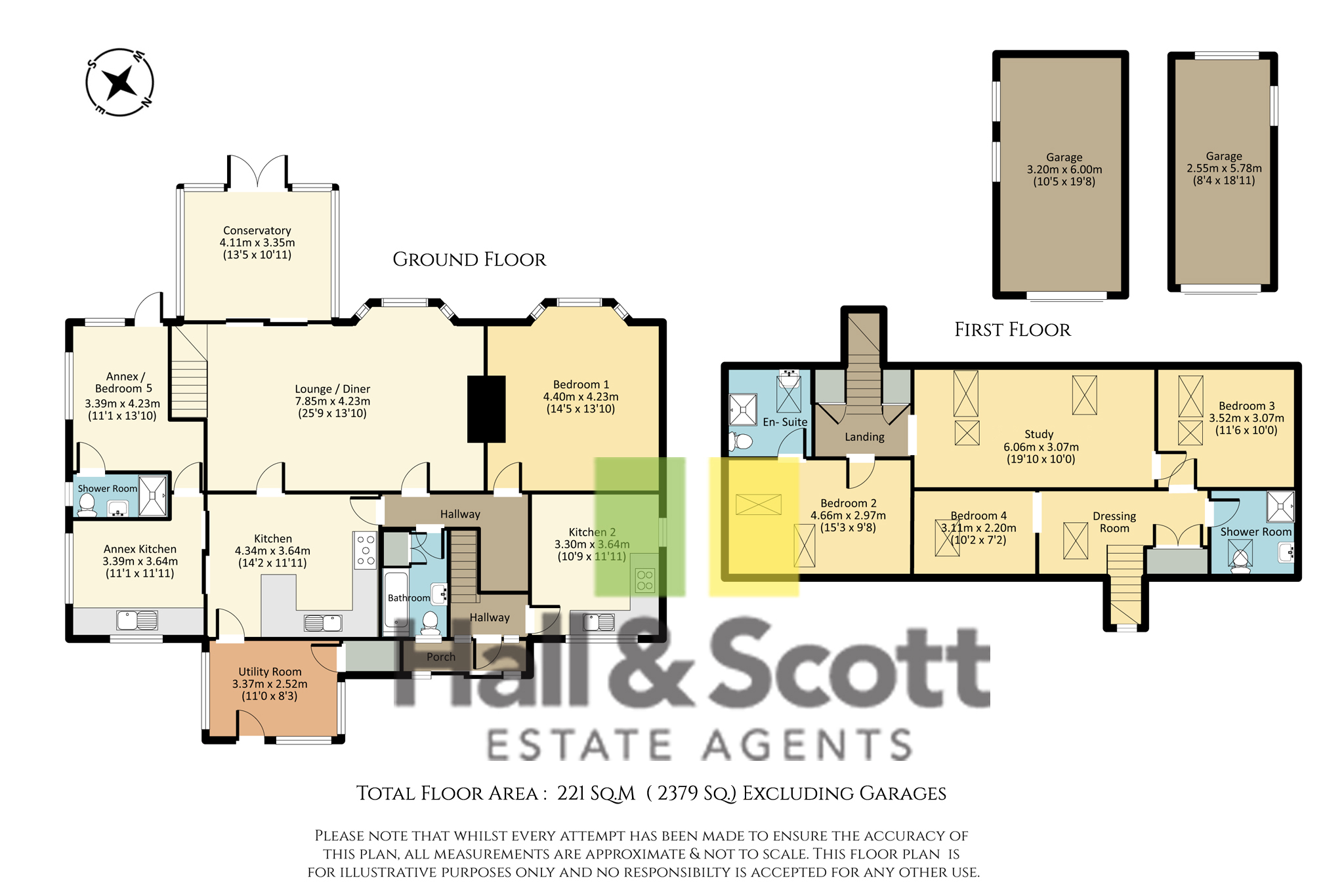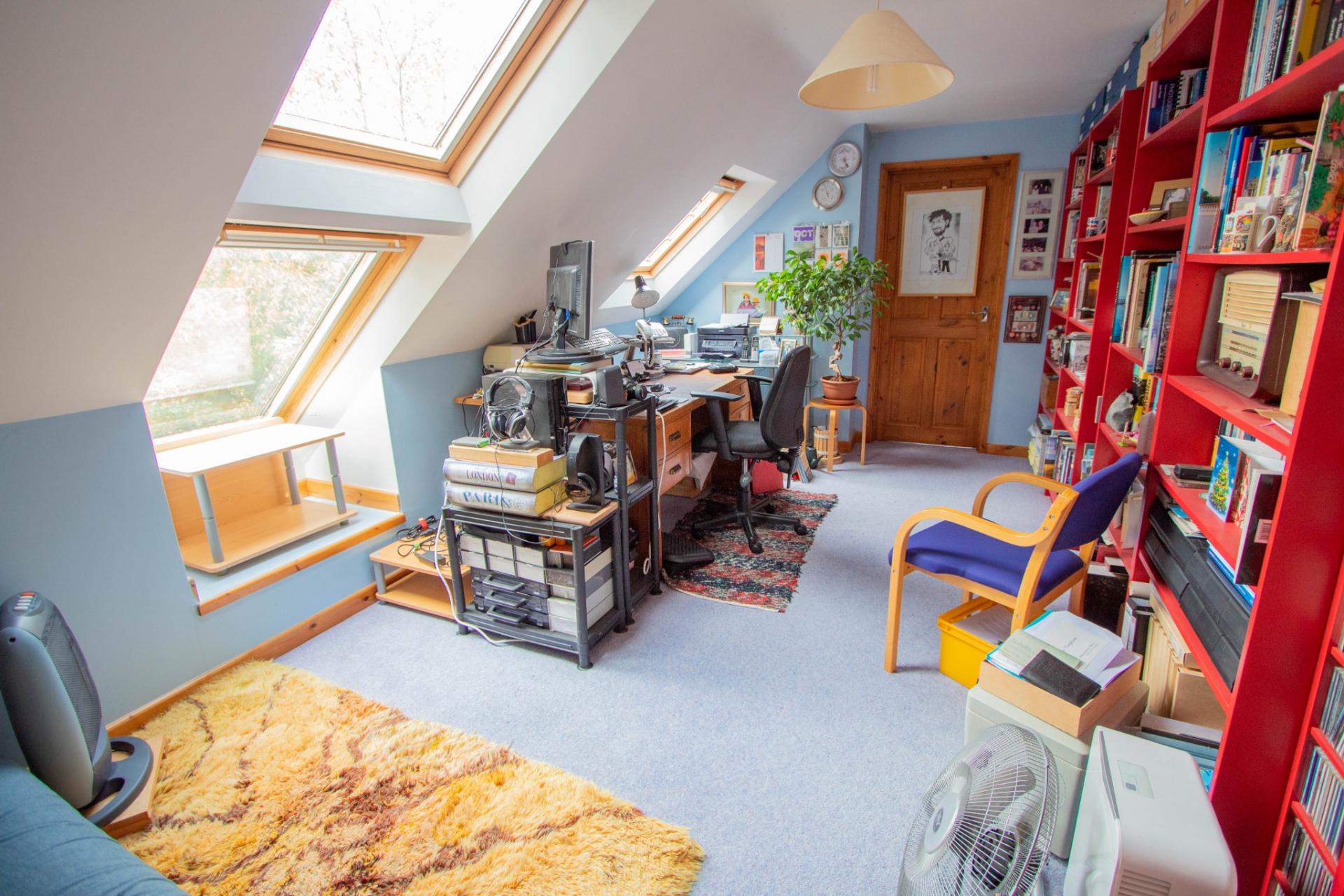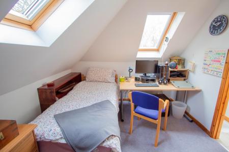 Accessed via a staircase from the lounge/dining room, the first floor offers two further bedrooms—one with an en-suite—and a spacious study, fully equipped for home working and enjoying views over the garden.