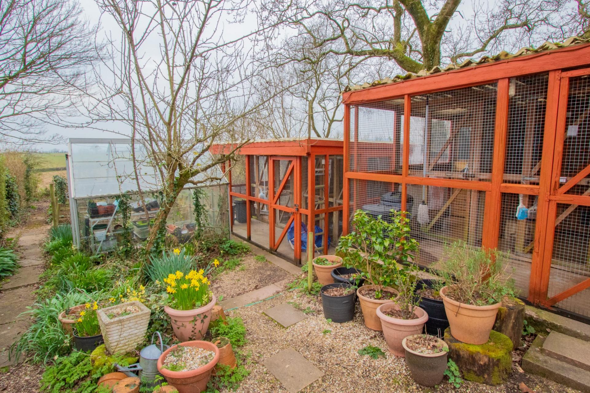 The rear garden features a patio area and is beautifully stocked with an abundance of shrubs and fruit trees, as well as a shed and greenhouse. The property benefits from private drainage, and the well-established boarding cattery is also located in the rear garden.