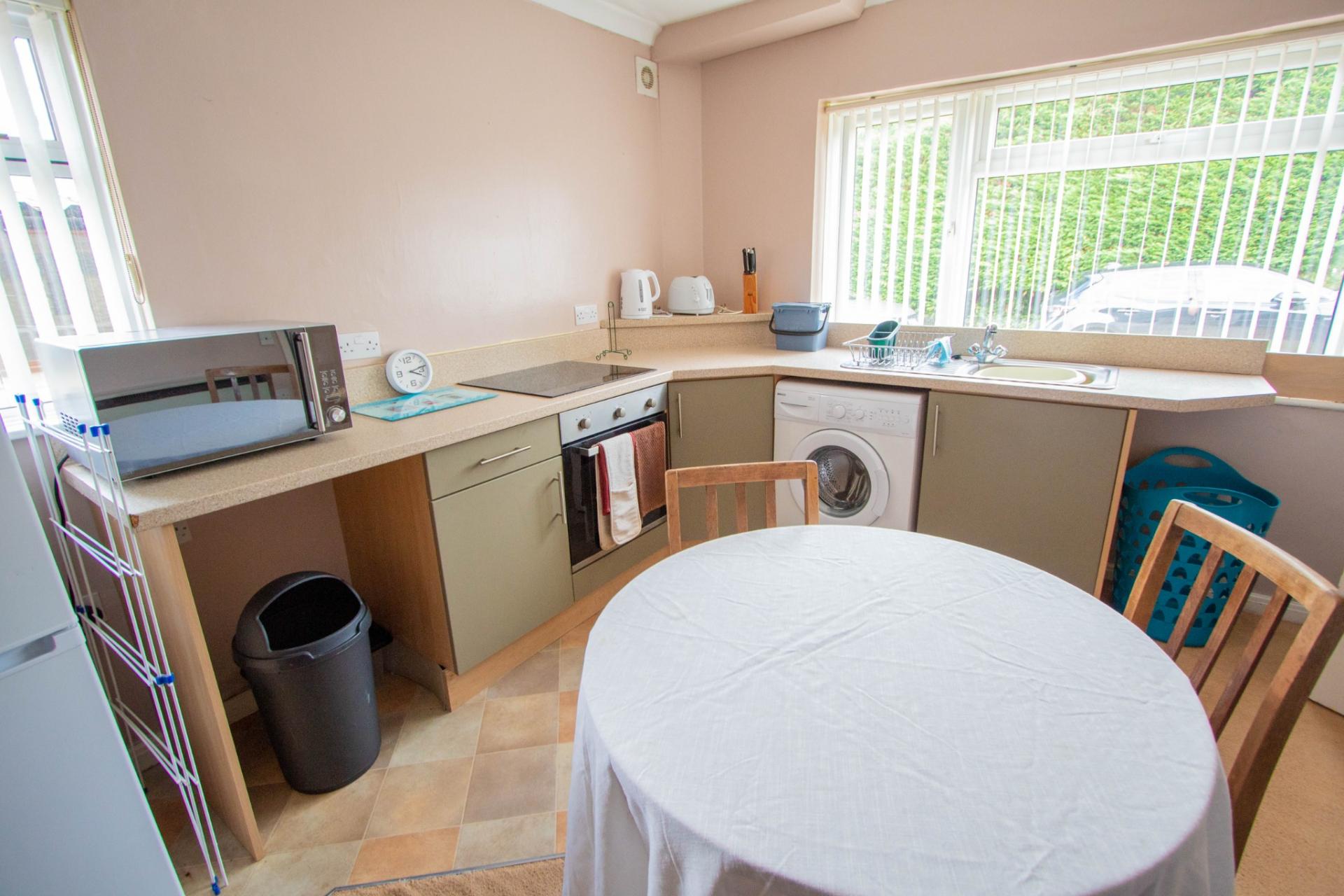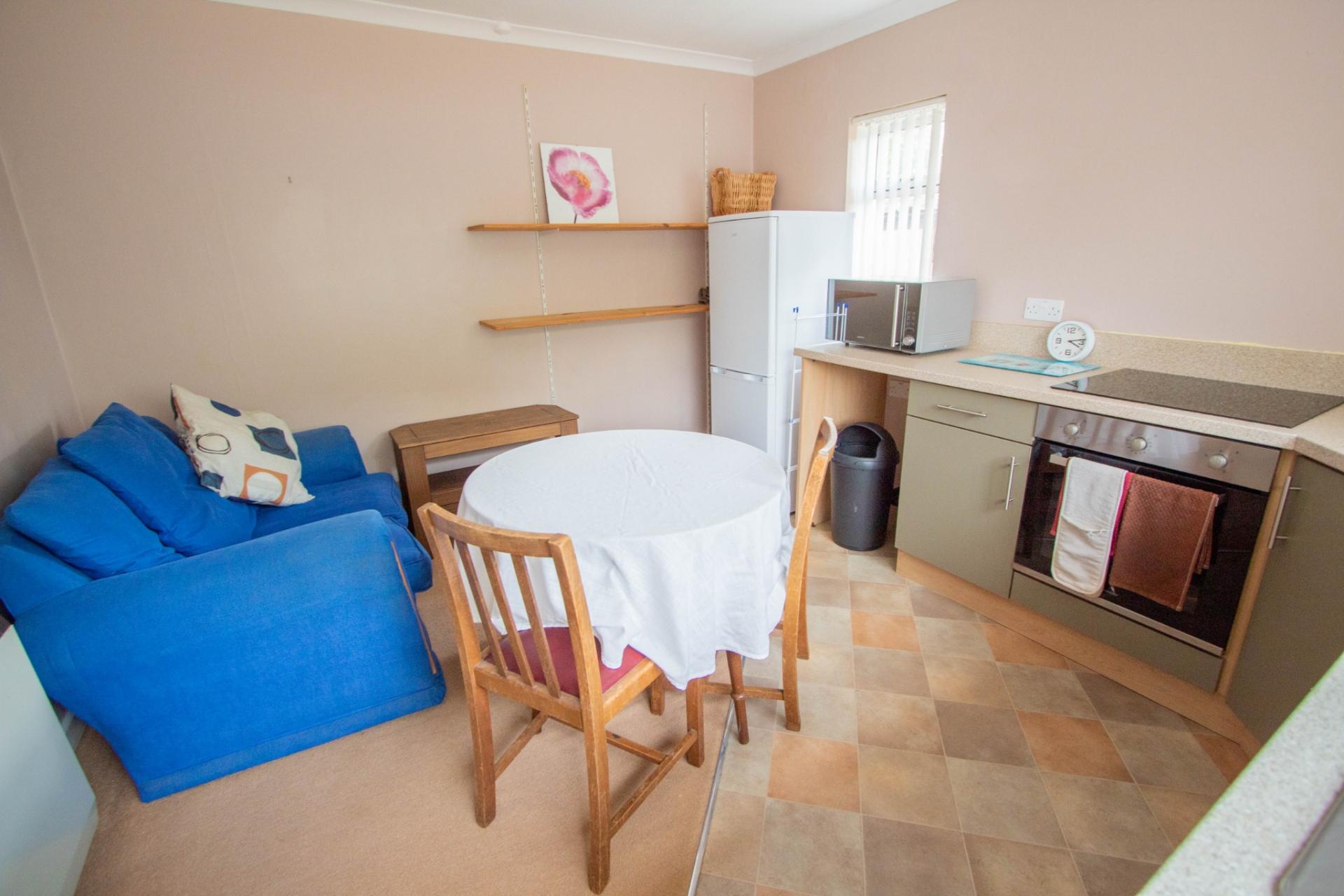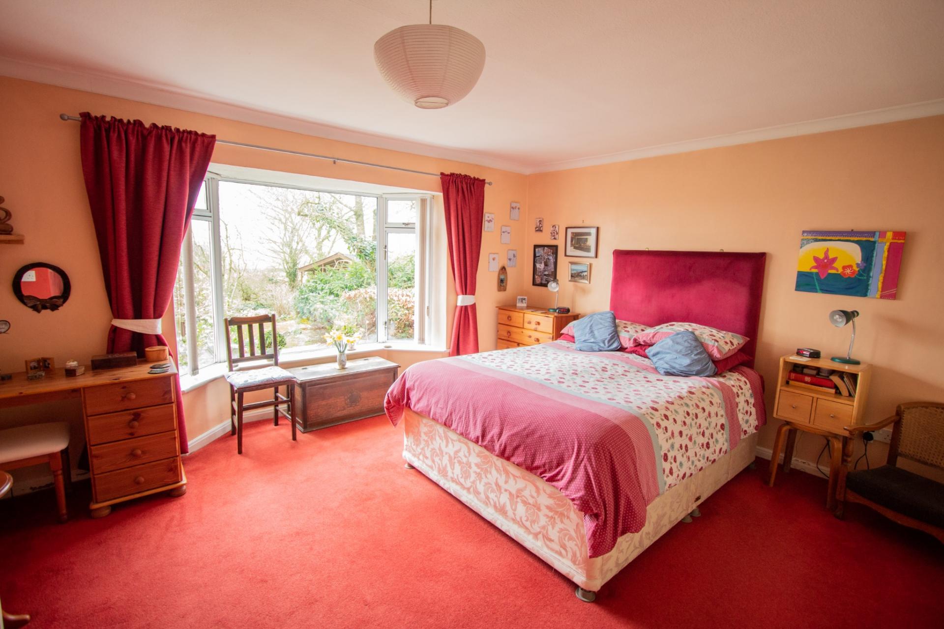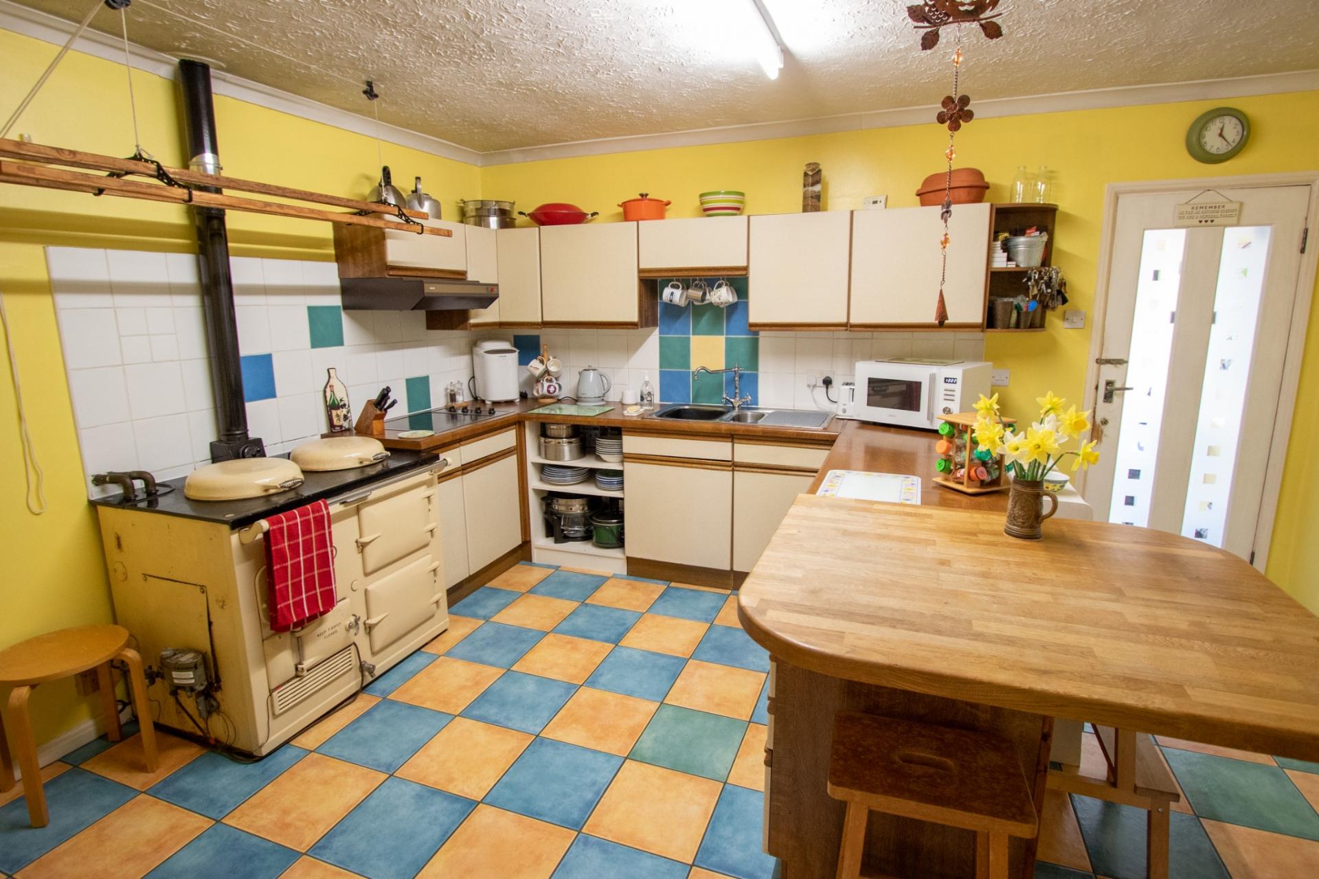 The accommodation is both spacious and flexible, making it ideal for a variety of living arrangements. It comprises a porch/utility room, a well-equipped kitchen with a range of wall and base units, worktop surfaces, an electric oven and hob, and an oil-fired AGA, which provides heating, hot water, and cooking. The kitchen features tiled flooring throughout. The main lounge/dining room is a generous space with a wood burner and leads into a bright conservatory, also with tiled flooring. A family bathroom and the main bedroom—complete with built-in wardrobes—are also located on the ground floor. Both the main bedroom and the lounge/dining room benefit from attractive bay windows overlooking the garden. In addition to the AGA, the property has electric heating, including night storage heaters, for use if required. A second kitchen is also located on the ground floor and features its own entrance and staircase to a first-floor bedroom and shower room. This area was previously occupied by a family member and is currently used for visiting friends and relatives. It could easily be incorporated back into the main house by removing a stud partition.