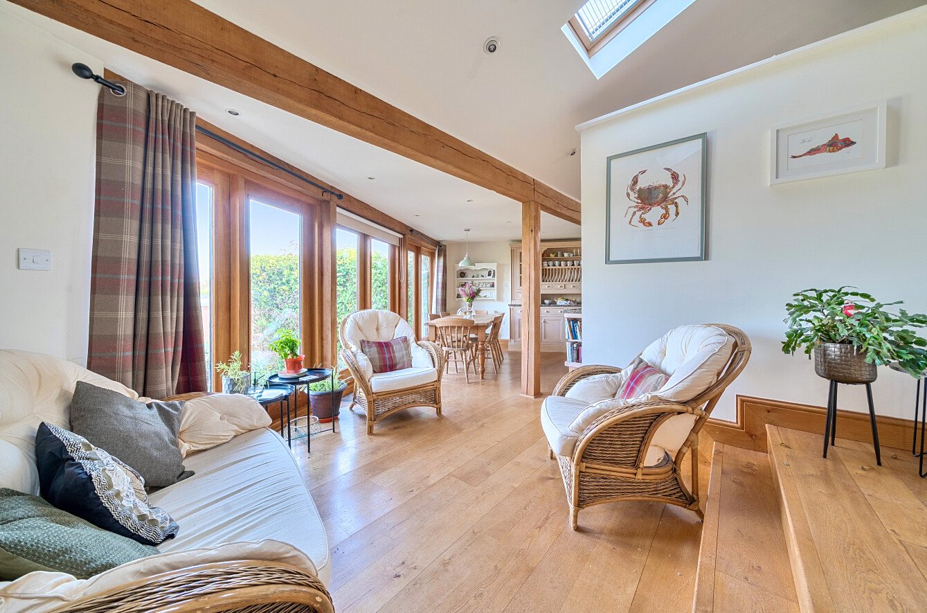 The welcoming entrance hall features a turning staircase. The spacious sitting room is a particular highlight, enjoying a triple aspect and an impressive inglenook fireplace. At the heart of the home is a superb open plan kitchen, breakfast and family space, designed for modern living, with oak framed French doors and windows opening onto the garden. The ground floor also includes a dining area, a dedicated home office, a separate utility room and a cloakroom.