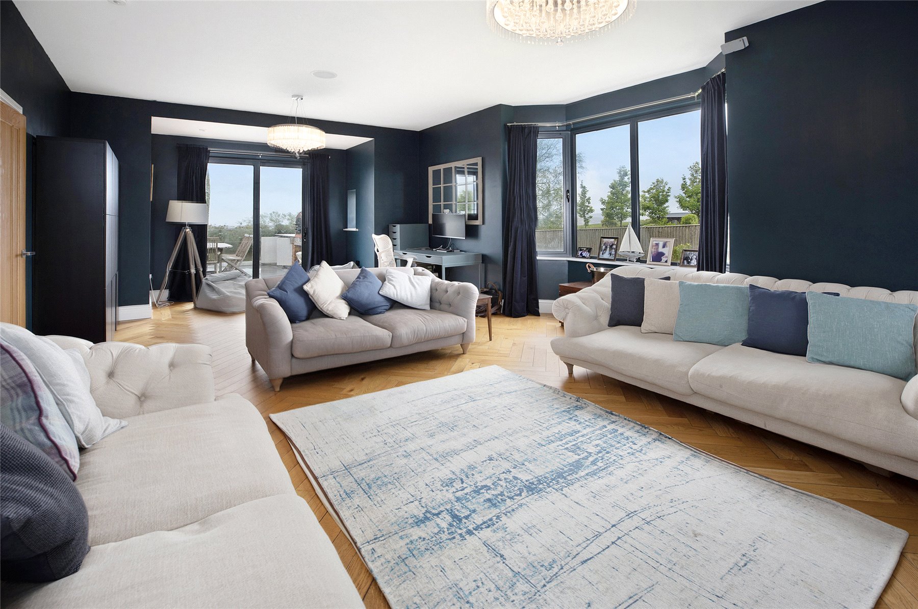To the right of the entrance, the expansive sitting room, spanning over 28 ft features a triple aspect design, creating a bright and airy atmosphere. It is equipped with a stylish gas fireplace and sliding patio doors that lead to a raised, south-facing decked terrace.