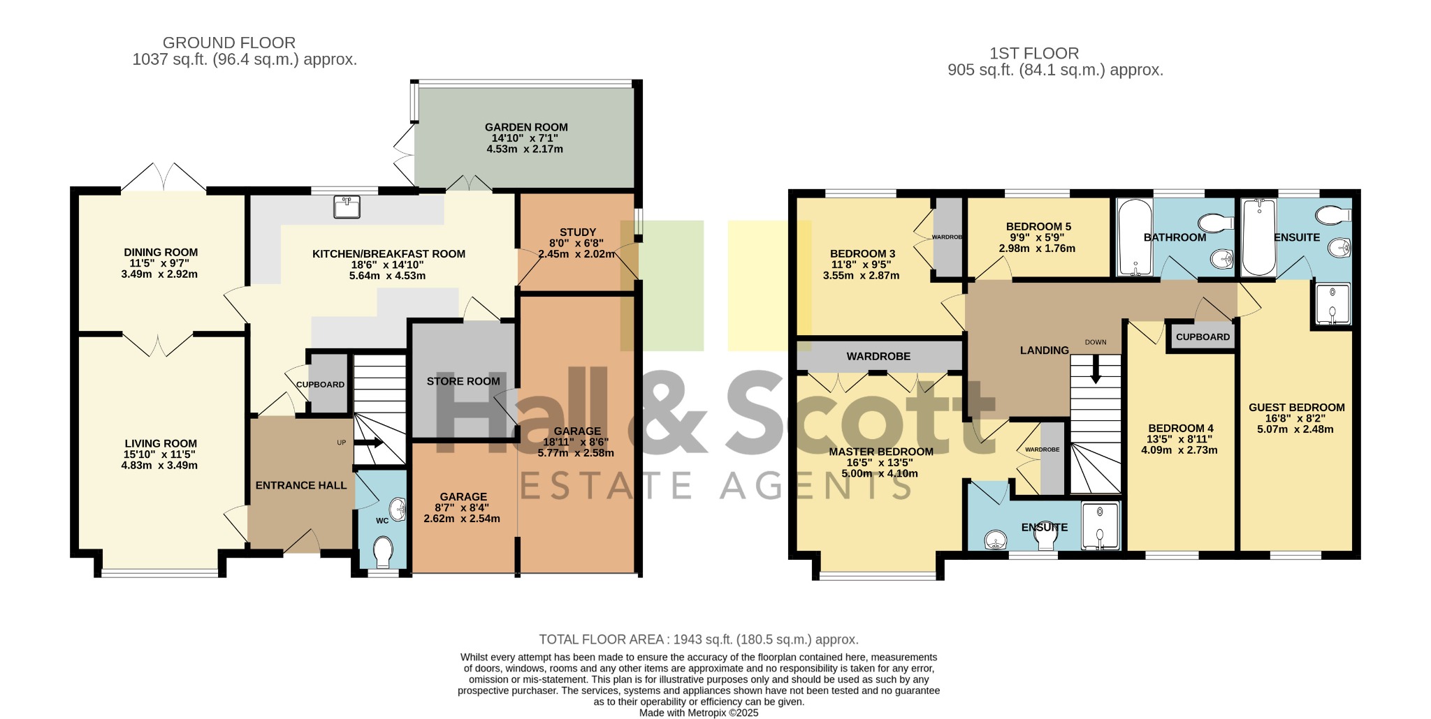 On the first floor there are 5 bedrooms, the master has a range of built-in wardrobes and an en-suite shower room, the guest bedroom also has an en-suite with shower cubicle and bath. Bedroom 3 has built-in wardrobes and there are 2 further bedrooms and a family bathroom suite.