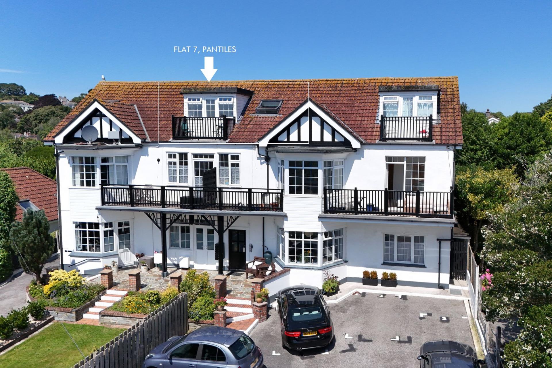 Thought to have been built in the 1920s, Pantiles Hotel was a favourite destination for holidaymakers for decades before the Pearce family converted it into 9 apartments in the late 1980s, creating a stylish and contemporary apartment. The apartments are no longer allowed to be commercially holiday let but one could have Number 7 as their own residential full time home or personal holiday home. Long letting is allowed and each owner has a share of the freehold and of course a say in what happens with the building. Apartment 7 is situated on the second floor and can be accessed via a communal front door with a wide turning staircase leading up to the first floor and a further staircase accessing the apartment. The accommodation is lovely and bright, with a southerly aspect that gives you views towards Falmouth Bay. At the back, you can enjoy views of the beautifully maintained communal gardens. The apartment comprises a living area with fitted seating bays, space for dining and a Velux window facing Southerly, offering views towards Falmouth Bay and the surrounding area. A well-appointed modern fitted kitchen and a modern shower room. The main double bedroom faces to the rear and the second bedroom to the front aspect with access out to the Southerly facing balcony to sit outside and enjoying panoramic 180 degree views. A good level of storage with both bedrooms benefitting from large, fitted wardrobes and an outside allocated outbuilding specifically for the apartment. An allocated off-road parking space situated to the front of the building. The apartments enjoy communal gardens with outside seating and dining spaces to enjoy in the sunshine and surrounded by beautiful plants, shrubs and trees. There is a 999-year lease in place since 2008. NO ONWARD CHAIN.