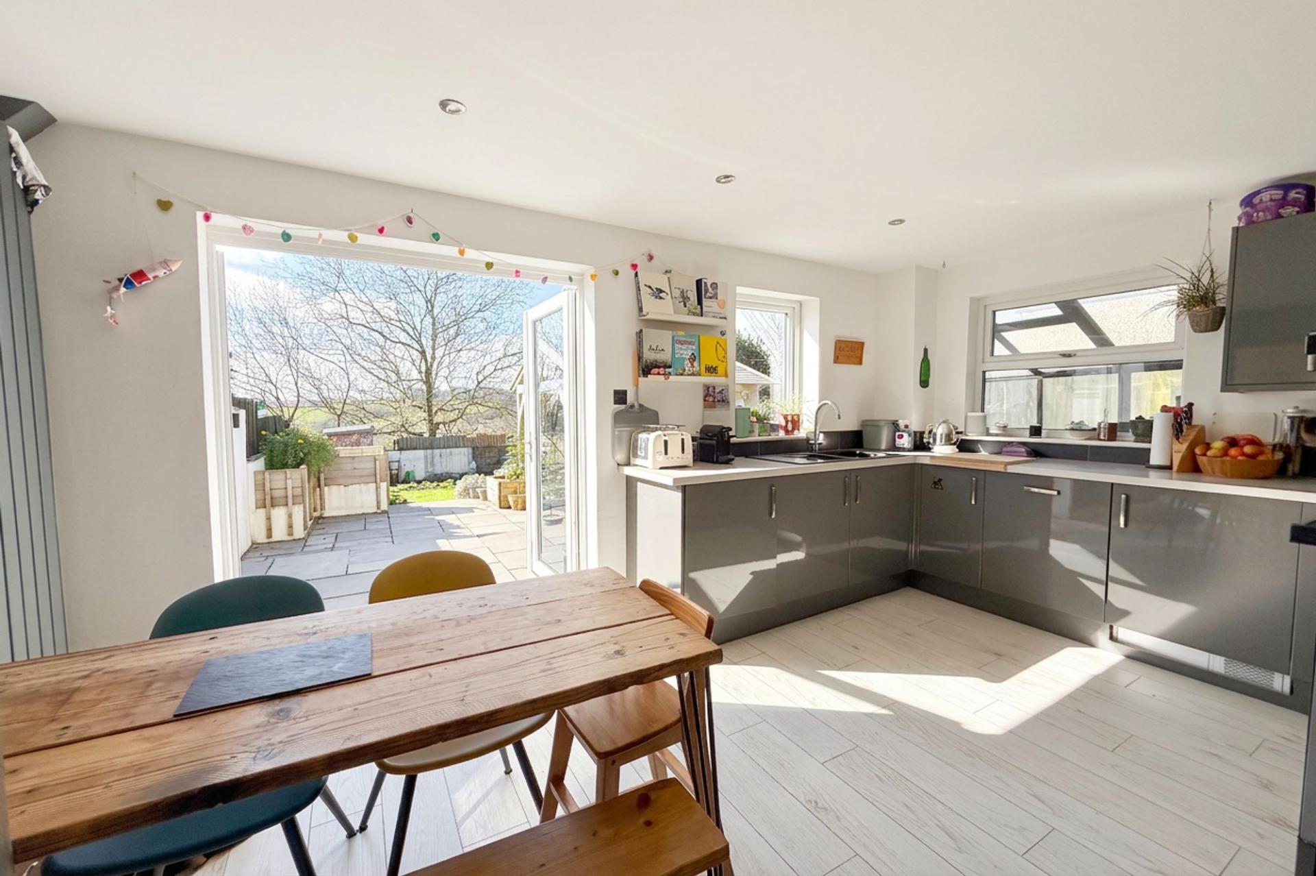 Built by Messrs Wimpey Homes in the 1970s, this well-proportioned semi-detached family home enjoys a no through road position and a sunny southerly facing rear garden with countryside views. The accommodation is bright and spacious throughout, with three bedrooms and a modern family bathroom to the first floor. On the ground floor there is a separate sitting room and a kitchen/dining room with French doors opening onto the rear garden, creating a great space for everyday living and entertaining. The former garage has been converted to provide flexible additional accommodation, currently used as a home office with an adjoining en-suite shower room, making it ideal as a guest suite or potential fourth bedroom. Outside, the landscaped rear garden is gently tiered and features a patio, lawn, outdoor kitchen and pergola, perfect for outdoor dining and relaxation. To the front is driveway parking with an electric vehicle charging point. Conveniently located in Falmouth and viewing is highly recommended. Overall, this is an impressive and versatile family home offering generous living space, natural light and a convenient location within Falmouth.