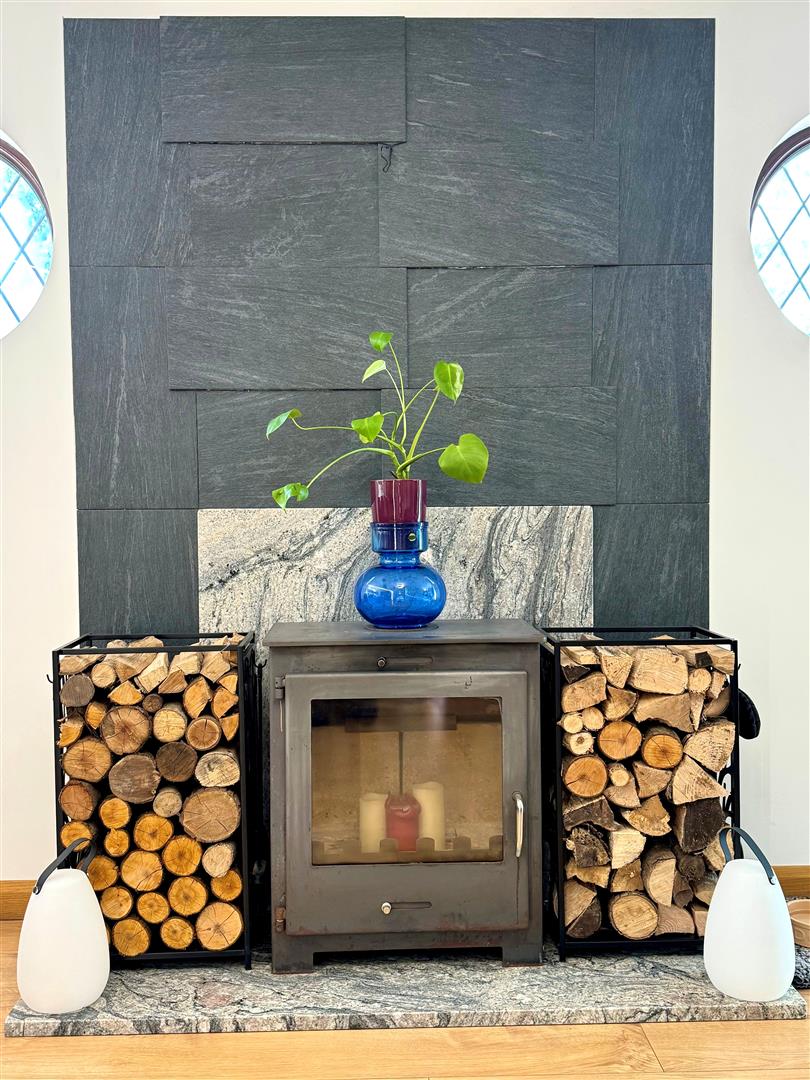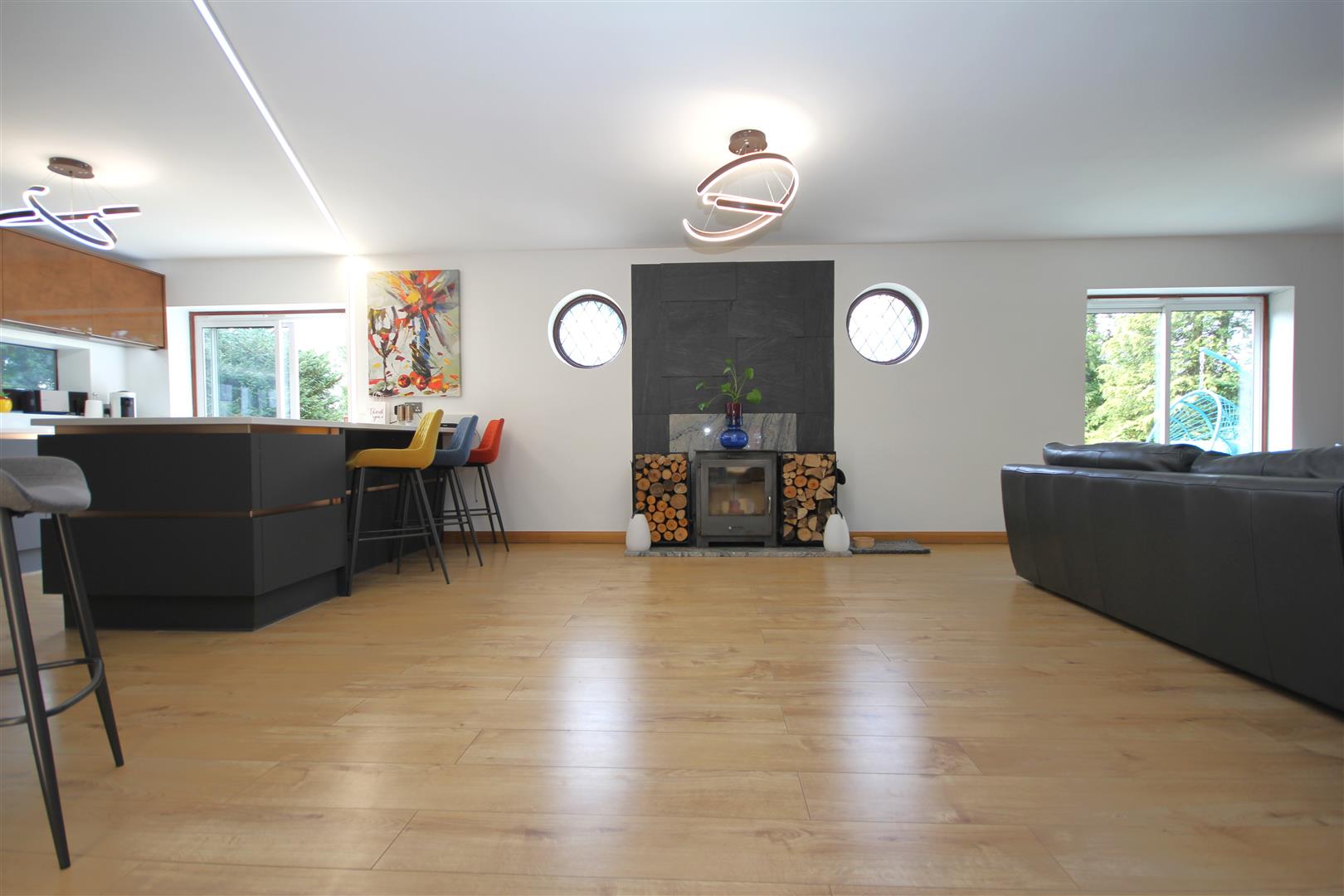 39'9ft Triple aspect open plan kitchen/dining/living room enjoying twin sets of double doors opening out to the rear garden & feature centrepiece slate surround fireplace with inset log burner