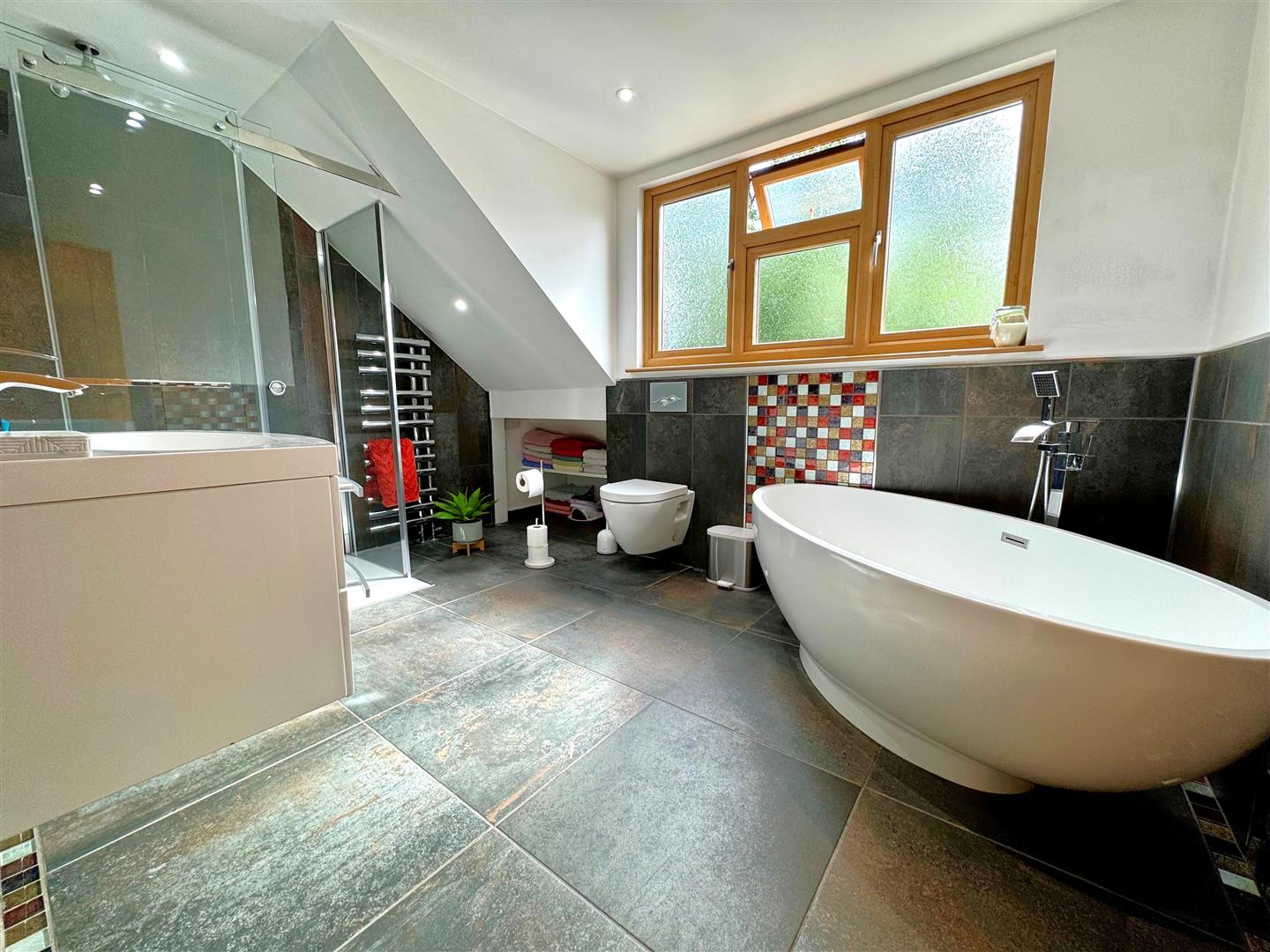 Spectacular re-fitted modern main bathroom comprising four piece white suite with feature freestanding bath, large low profile shower cubicle tray & attractive wall/floor tiling