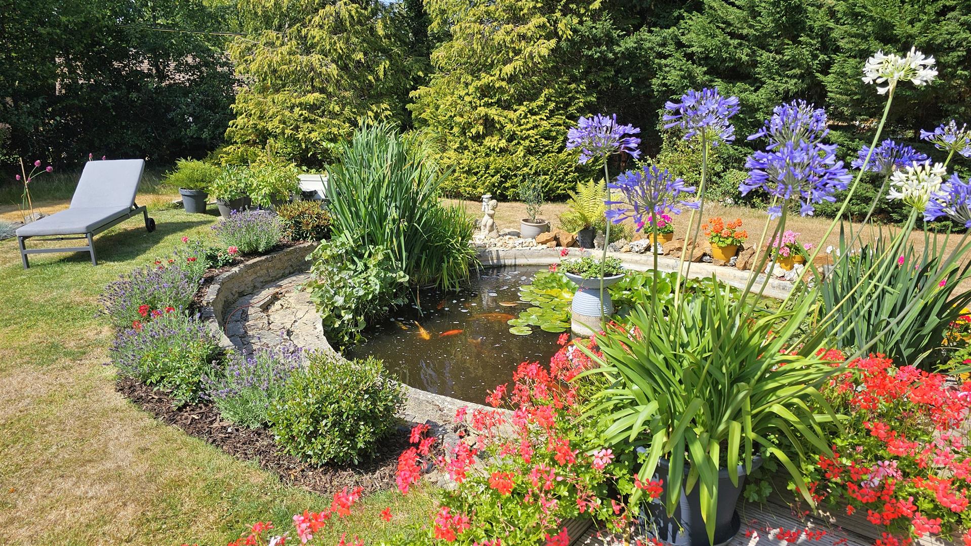 Rear gardens majority laid to lawn with decked sun terraced and paved patio area perfect for alfresco dining, feature freshwater pond & display flowers/shrubbery