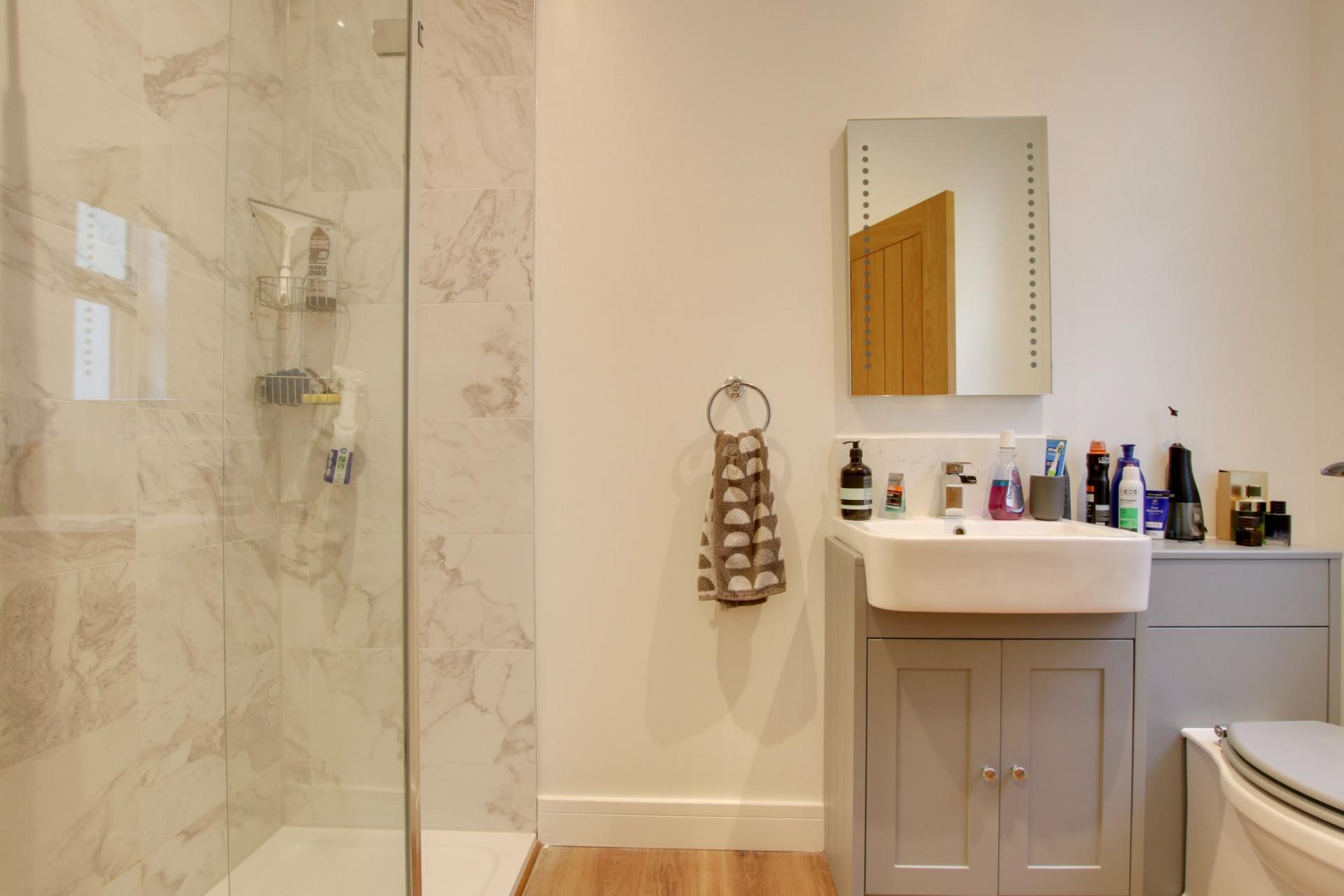 Double glazed window to side elevation. Walk-in shower cubicle with wall mounted electric shower unit. Vanity unit with wash hand basin and storage beneath. Low level close coupled WC. Heated towel rail. Extractor fan.