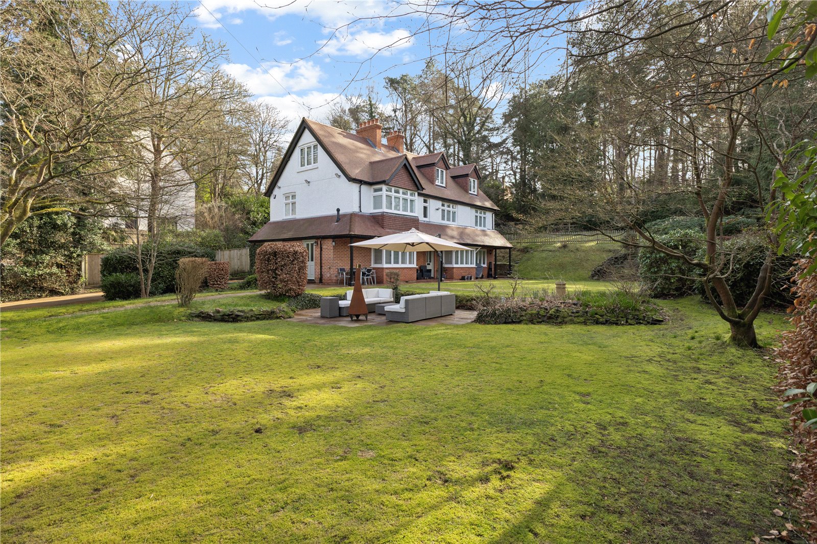 Outside - Rear Wonderful rear gardens laid predominantly to lawn, interspersed with mature borders. Attractive paved seating area ideal for entertaining and al fresco dining, screened and enclosed by mature hedging - rhododendrons, azaleas, shrubs, trees and a large specimen Japanese maple; offering a good degree of privacy and seclusion. The whole extending to approx. 0.57 of an acre.